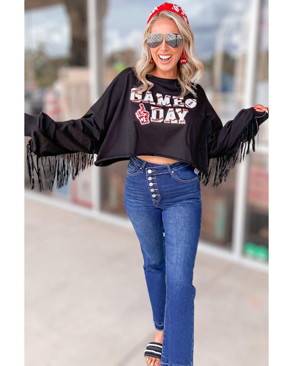 • Black GAME DAY Rugby Sequined Tasseled Cropped Sweatshirt