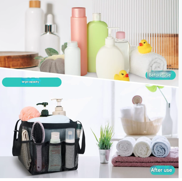 Black Large Multi-Pocket Mesh Beach Tote Bag - Quick-Dry Travel & Gym Organizer with Drawstring Closure