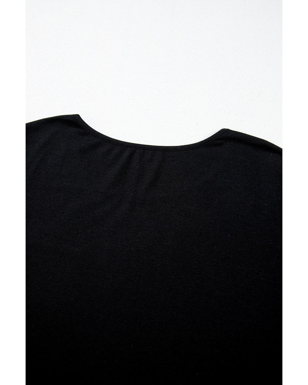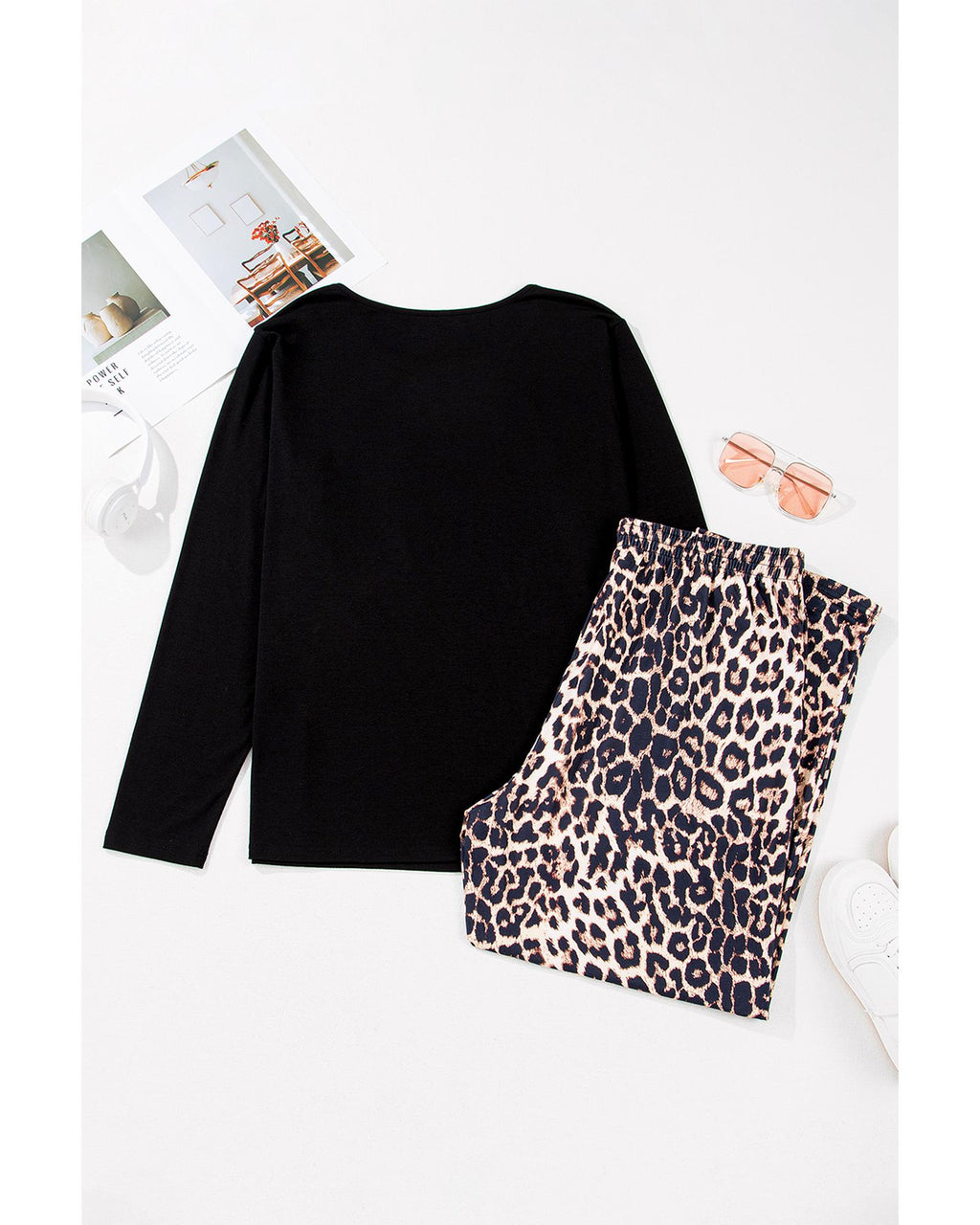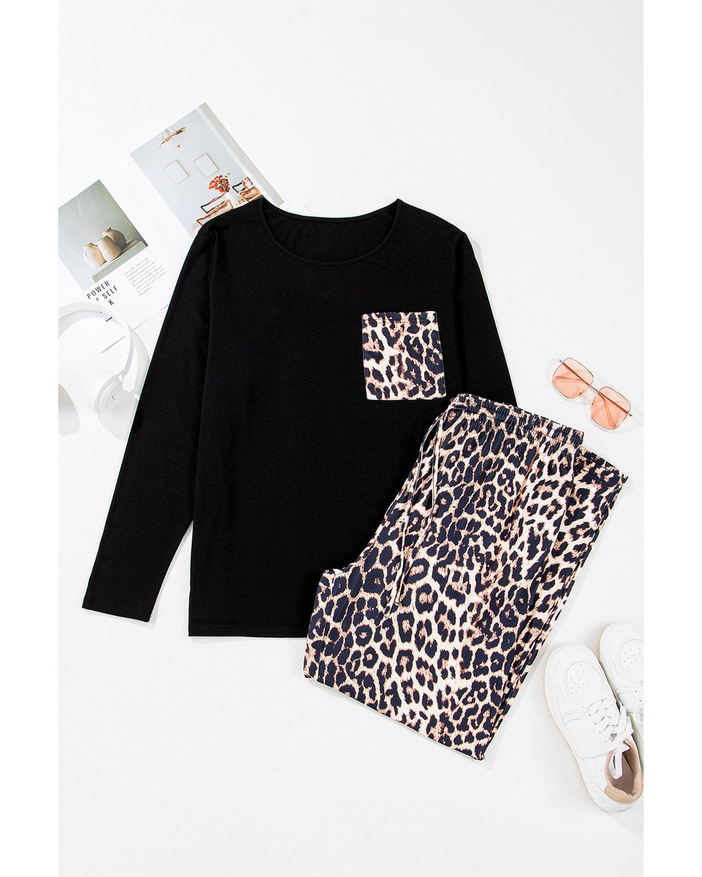 Black Leopard Patched Pocket Long Sleeve Top Plus Size Pants Set - 1X