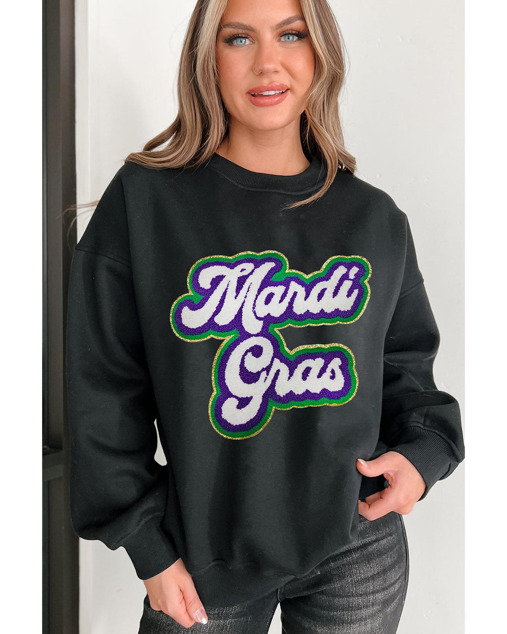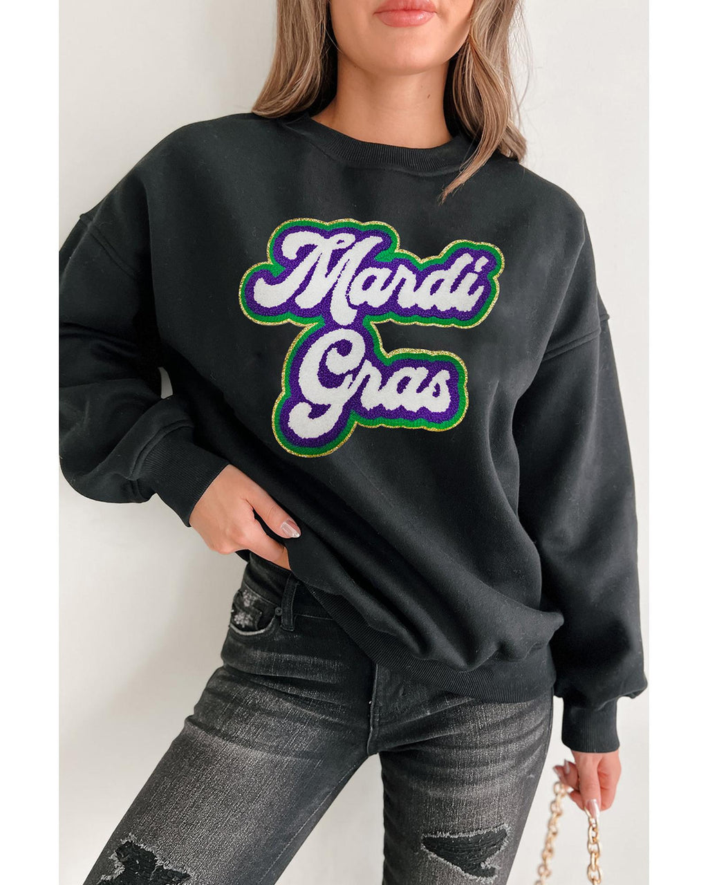 - Chenille patches add a playful textured touch to the sweatshirt
