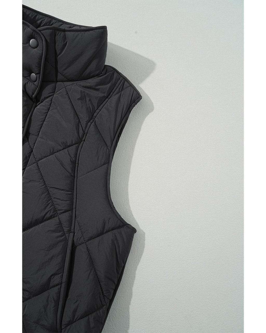 • Black quilted high neck button up pocket vest coat