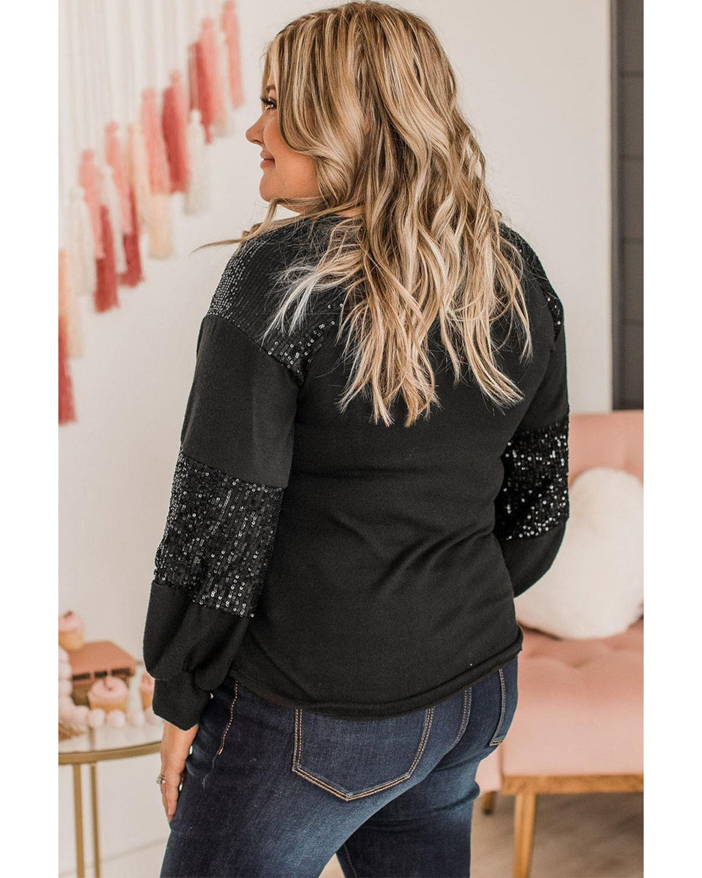 Black Rhinestone Heart Rugby Football Pattern Sequin Patched Sleeve Plus Size Top - 3X