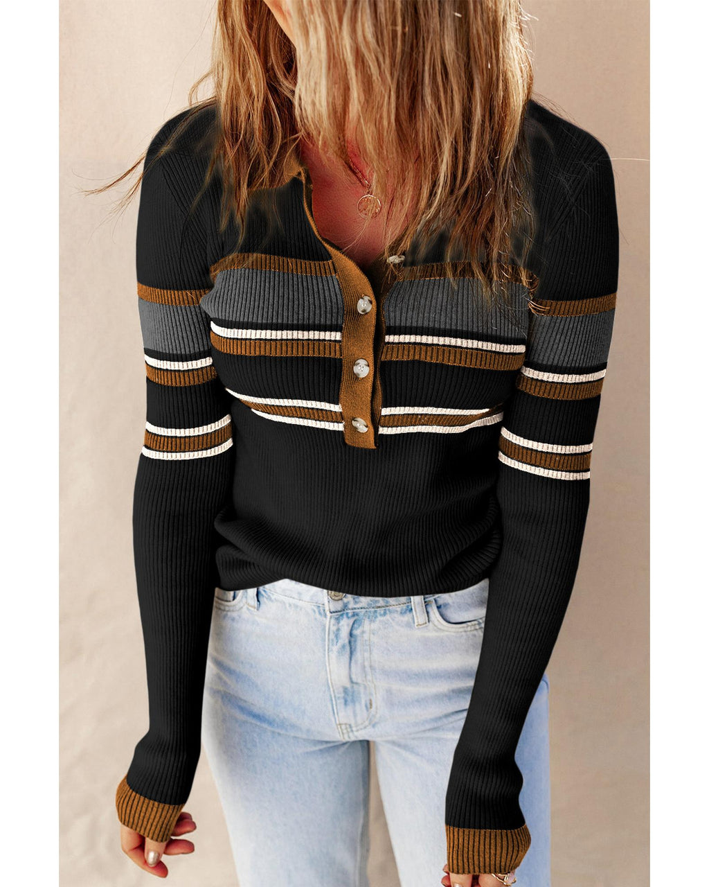 Black Rib Knitted Stripe Detail Henley Sweater - 2XL