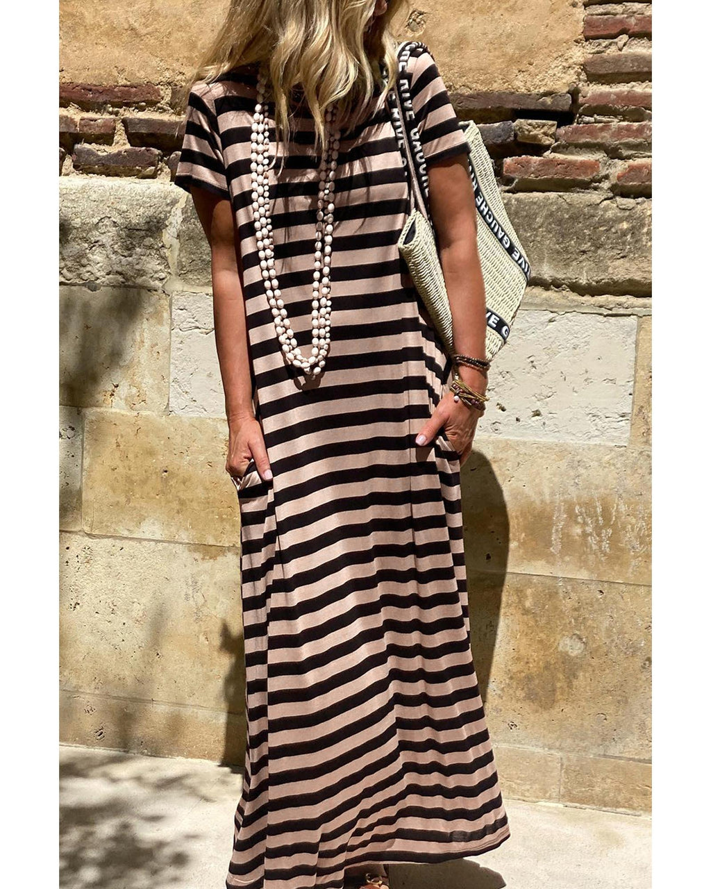 Black Stripe Casual Round Neck T-shirt Maxi Dress with Pockets - XL