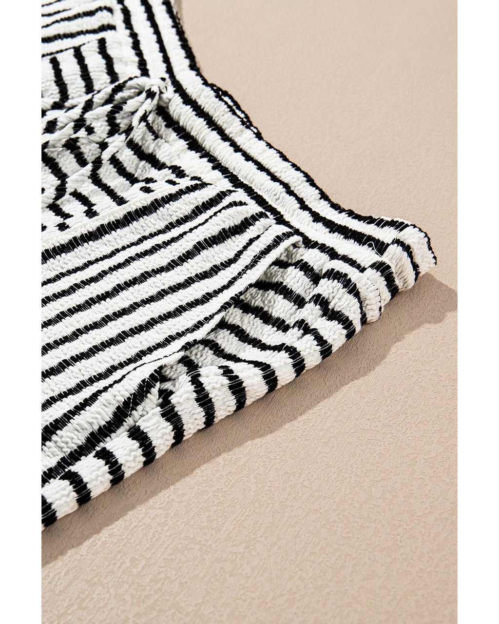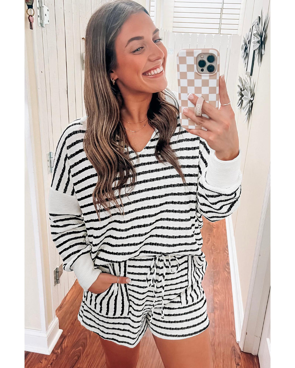 Black Stripe Collared V Neck Long Sleeve Top Plus Shorts Set - 2X