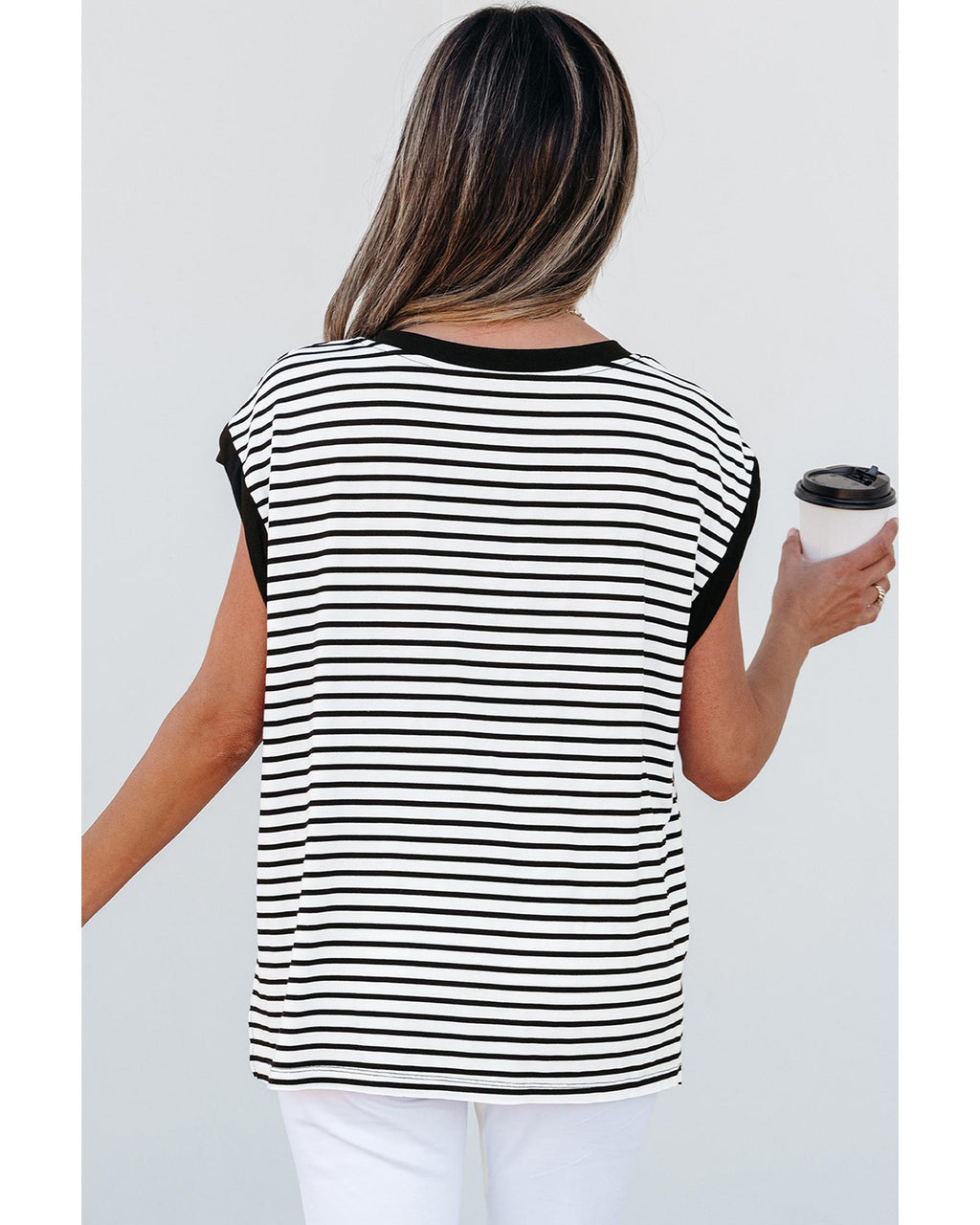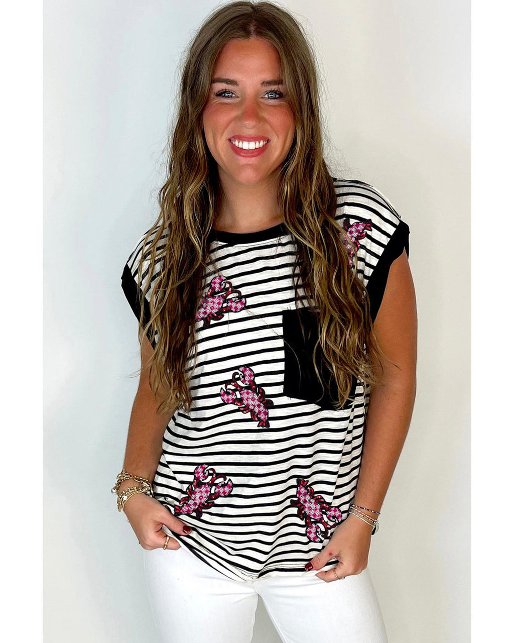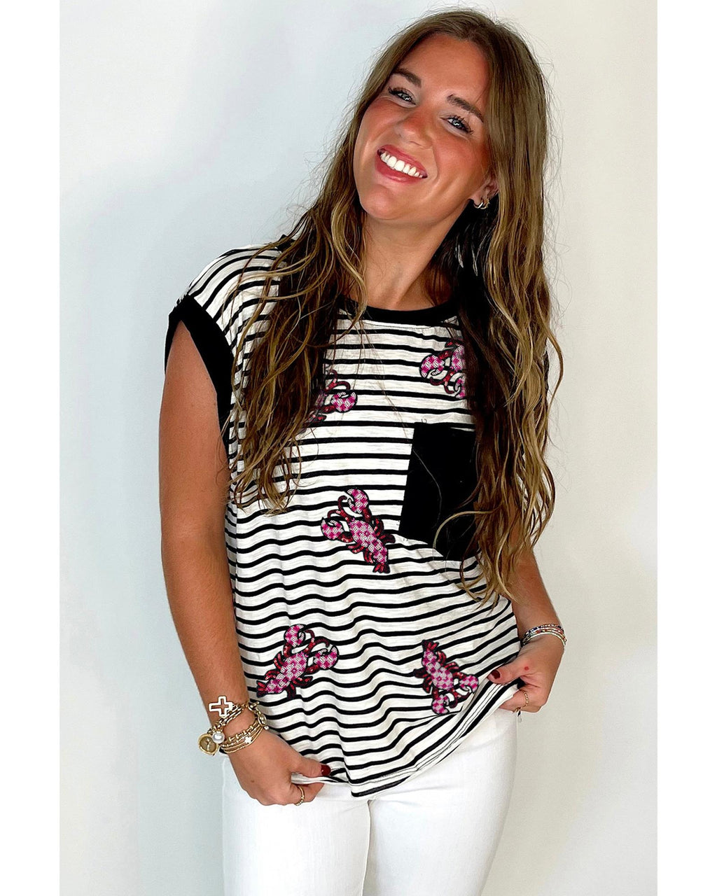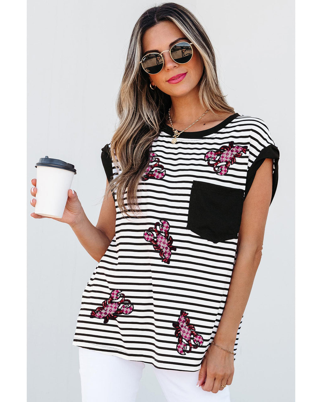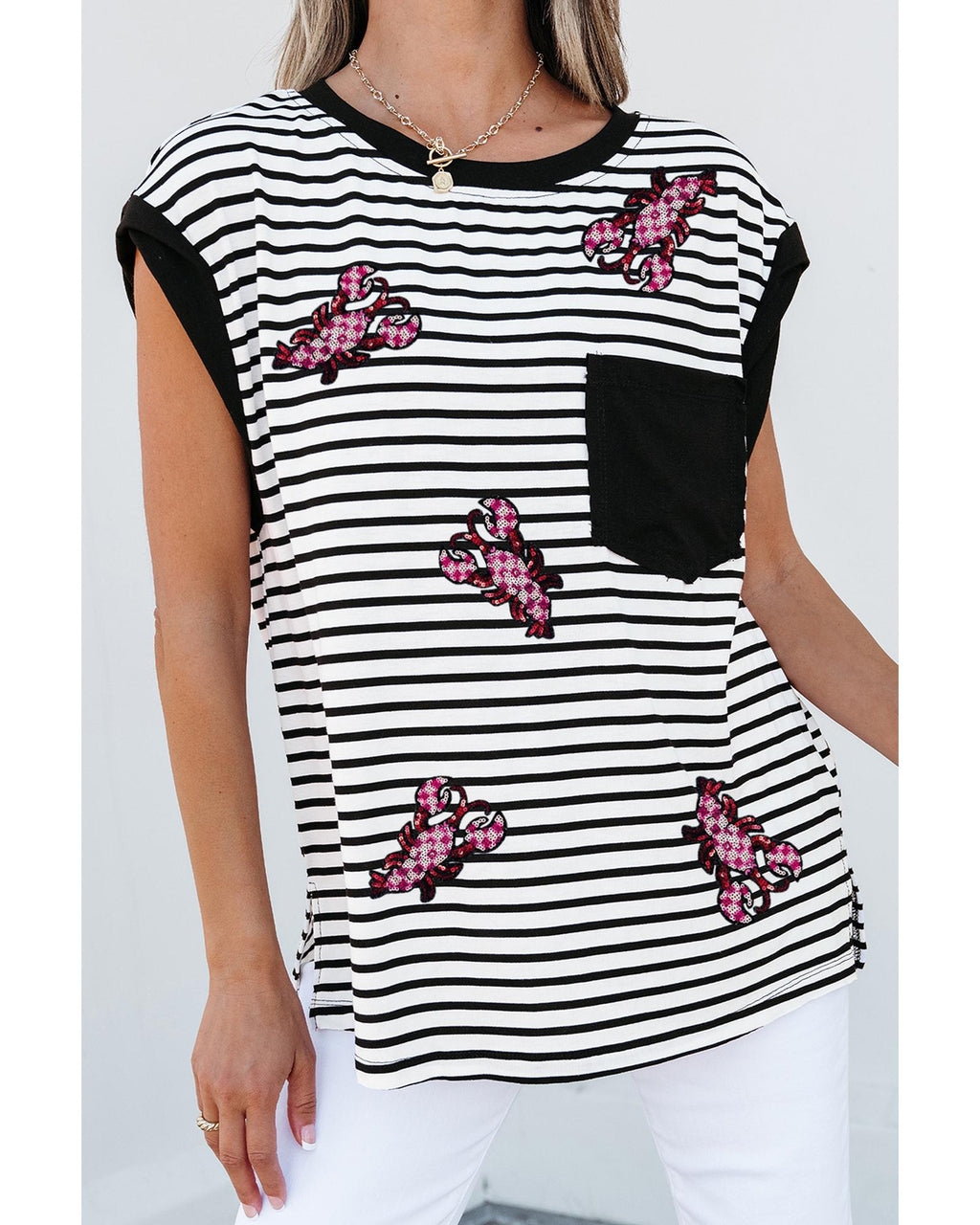 Black Stripe Sequined Lobster Patched Pocket Casual Tank Top - XL