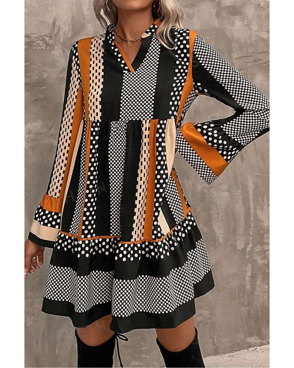 Black Striped Polka Dot Print Ruffled Hem V Neck Mini Dress - S