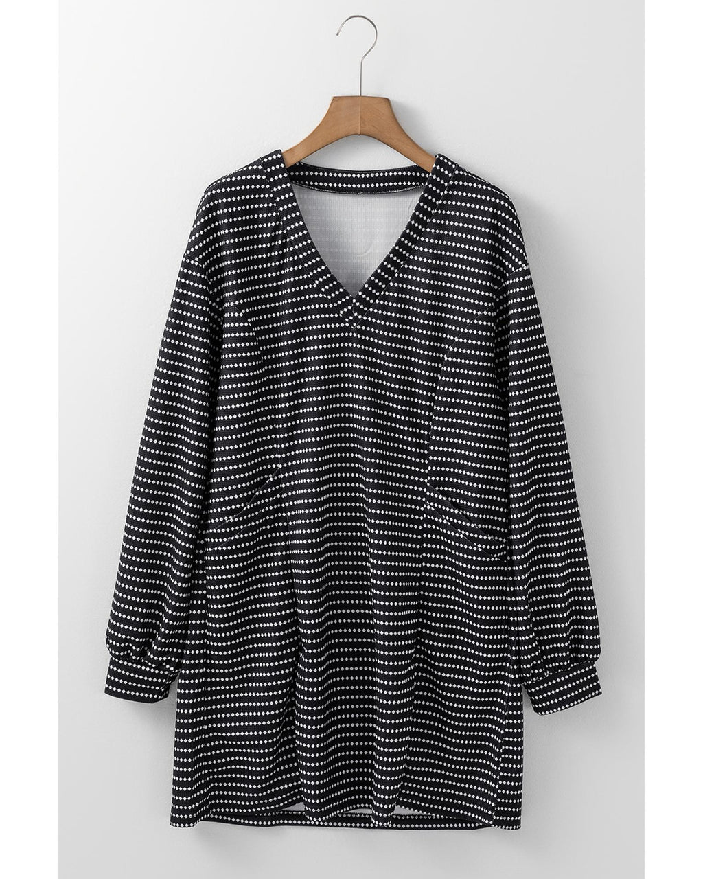 Black Striped V Neck Long Puff Sleeve Shift Dress - XL