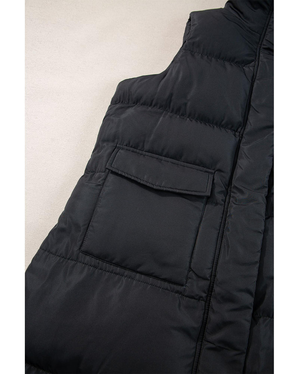 Black Windproof Longline Full Zipper Puffer Vest with Pockets - XL