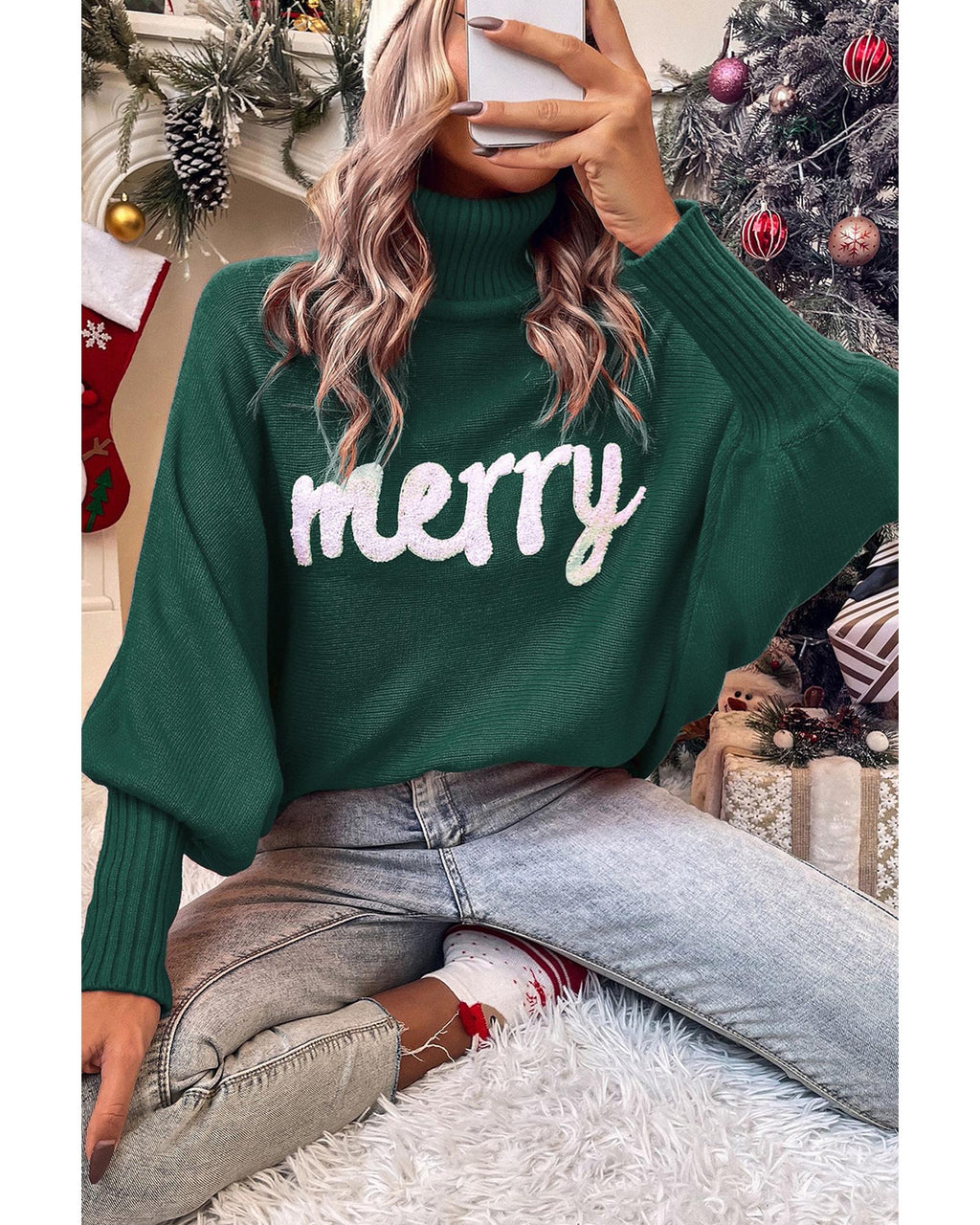 Blackish Green Merry Letter Embroidered High Neck Sweater - L