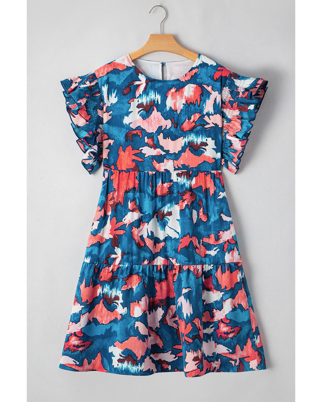 Blue Abstract Print Shirred Ruffled Short Sleeve Tiered Plus Size Mini Dress - 1X