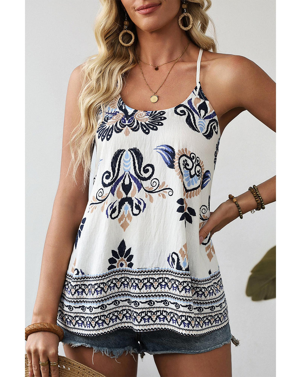 • Blue Bohemian Fashion Print Spaghetti Straps Loose Tank