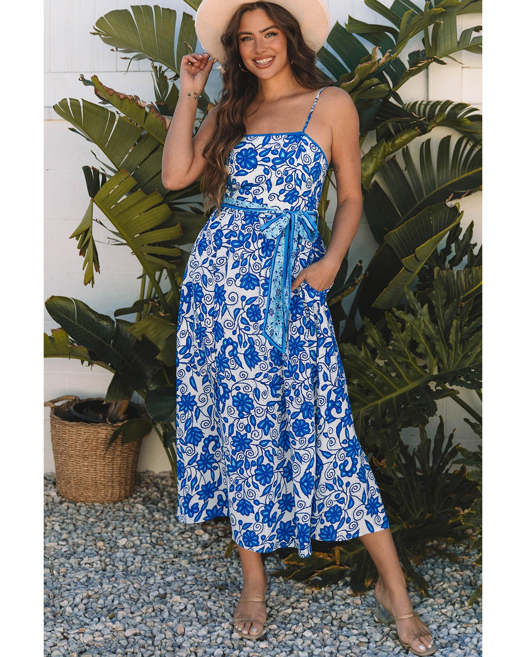 • Blue Floral Printed Spaghetti Strap Maxi Dress with Waist Tie