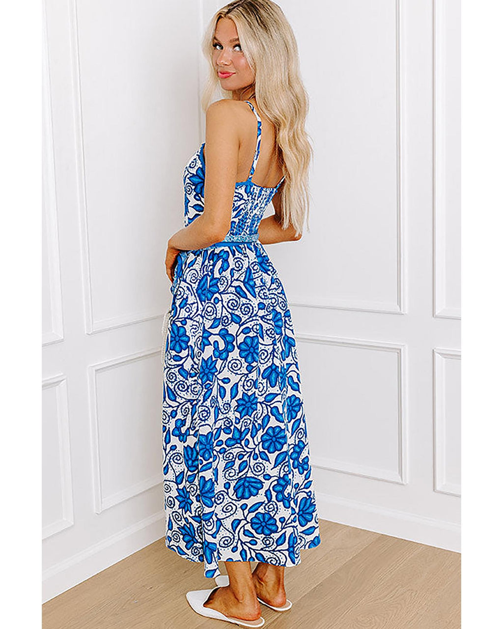 • Blue Floral Printed Spaghetti Strap Maxi Dress with Waist Tie