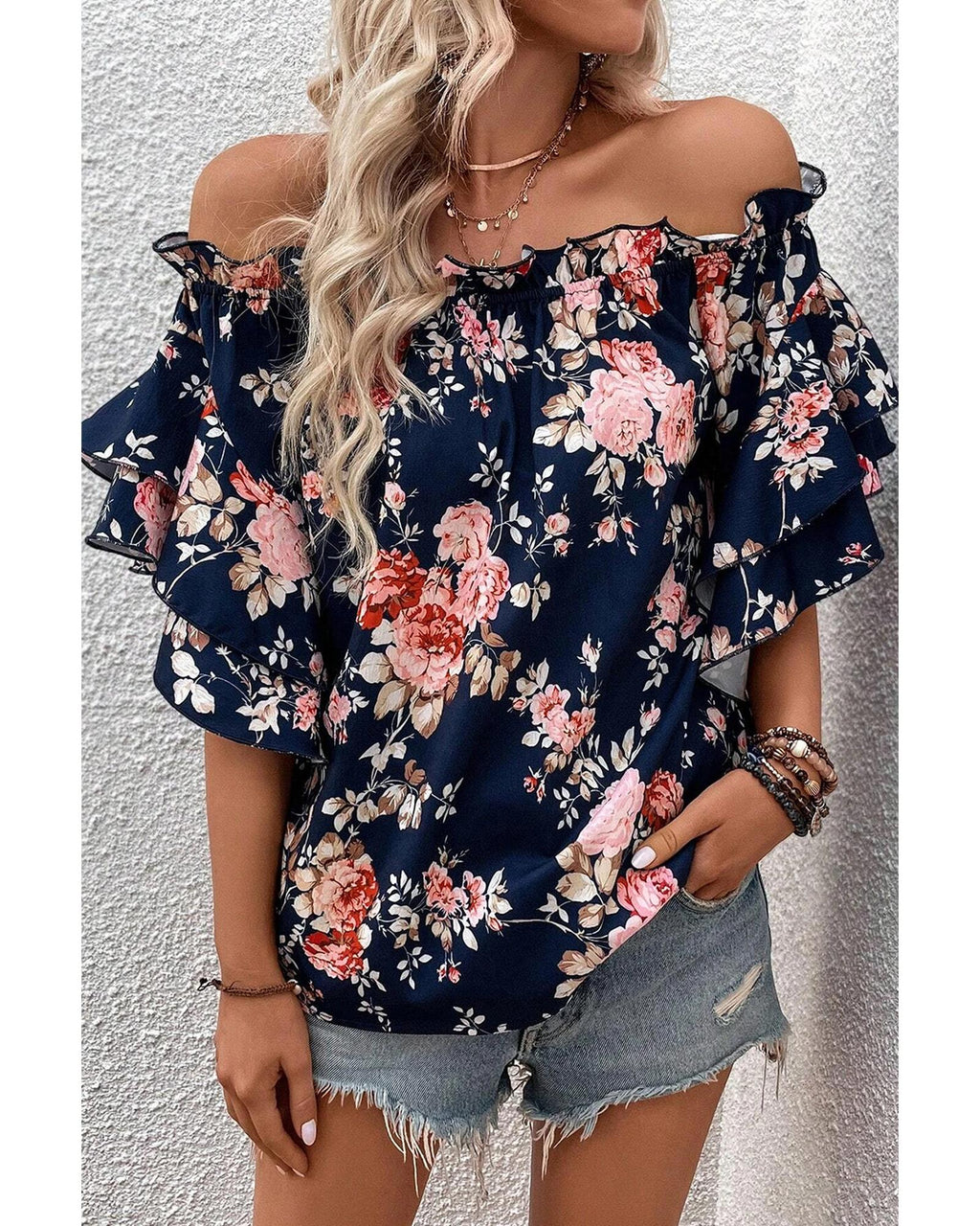 Blue Ruffle Off Shoulder Flounce Sleeve Floral Blouse - S