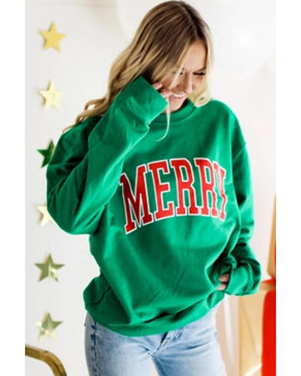 Bright Green MERRY Graphic Pullover Sweatshirt - M