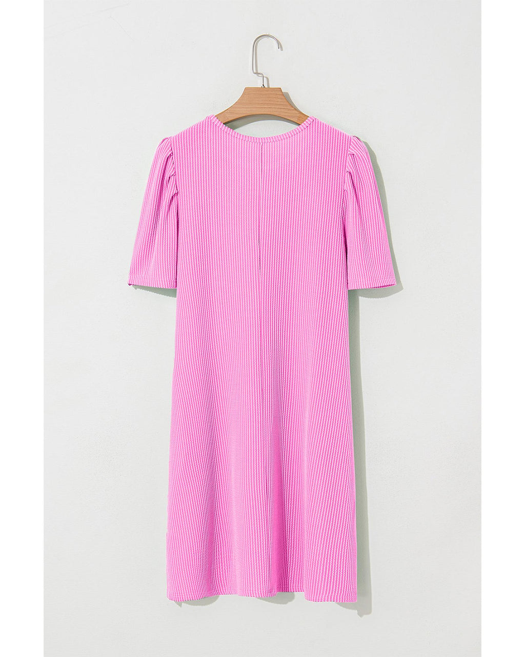 Bright Pink Corded Knit Crew Neck Puff Sleeve Shift Mini Dress - S