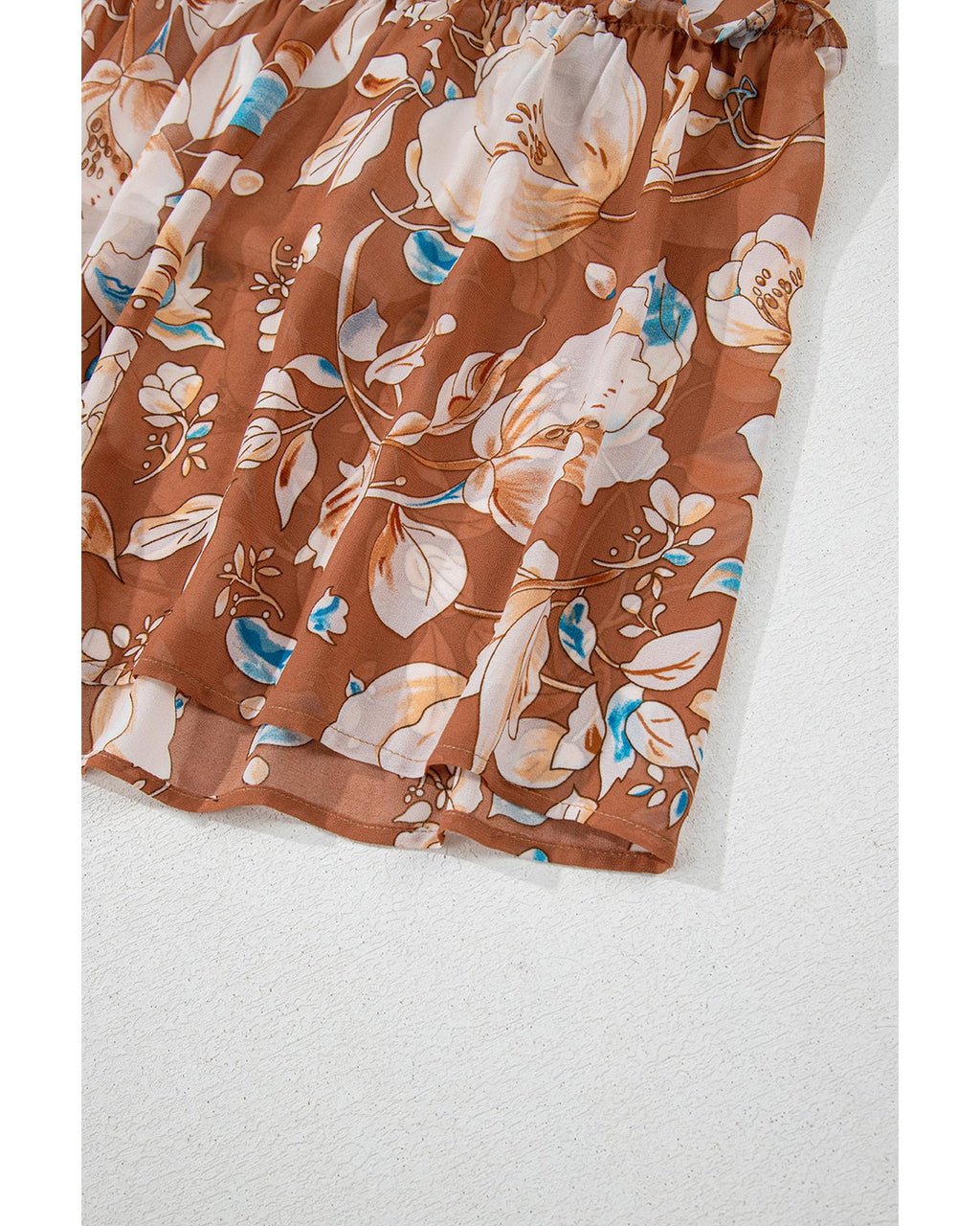 • Brown Floral Print Shirred Square Neck High Waist Maxi Dress