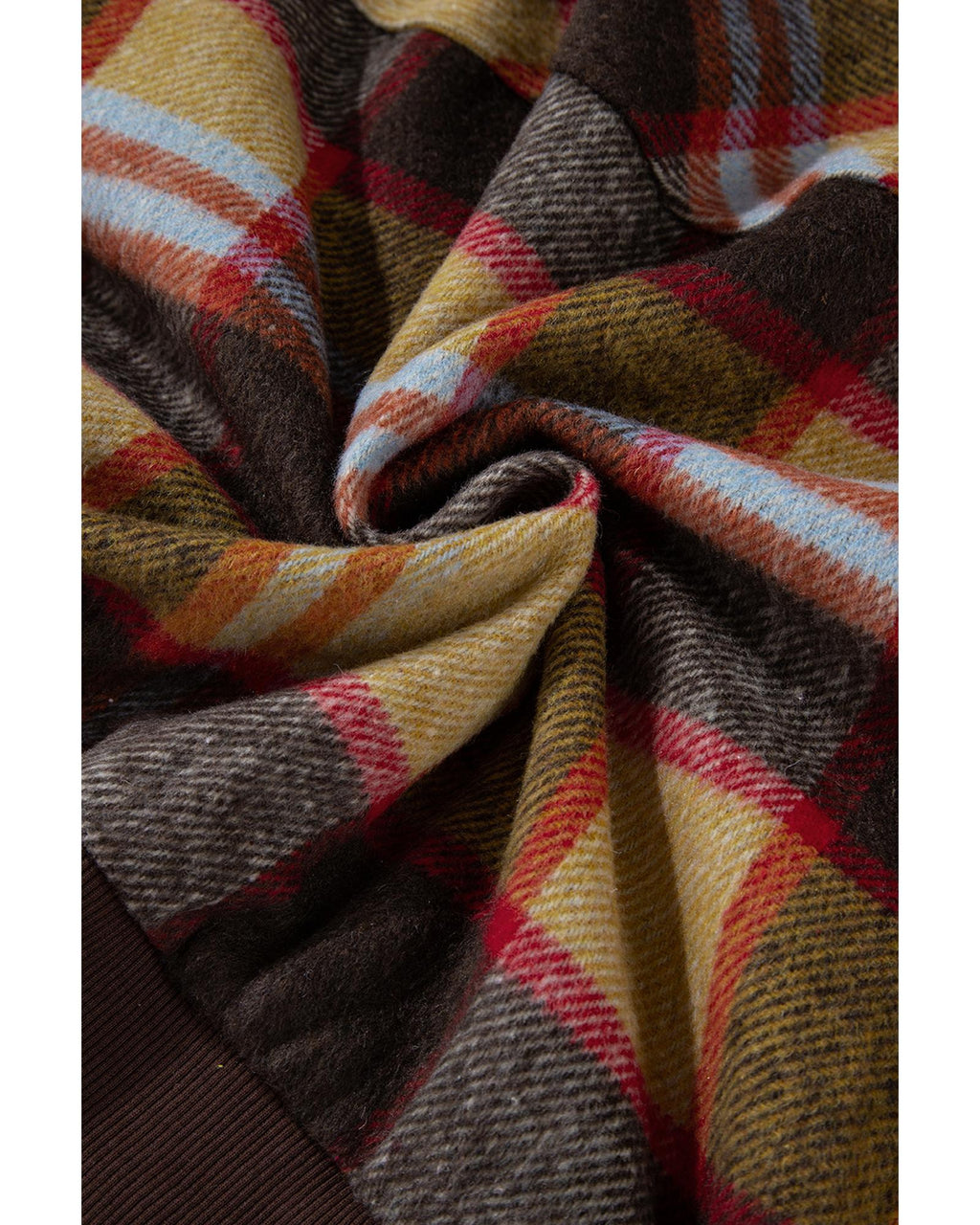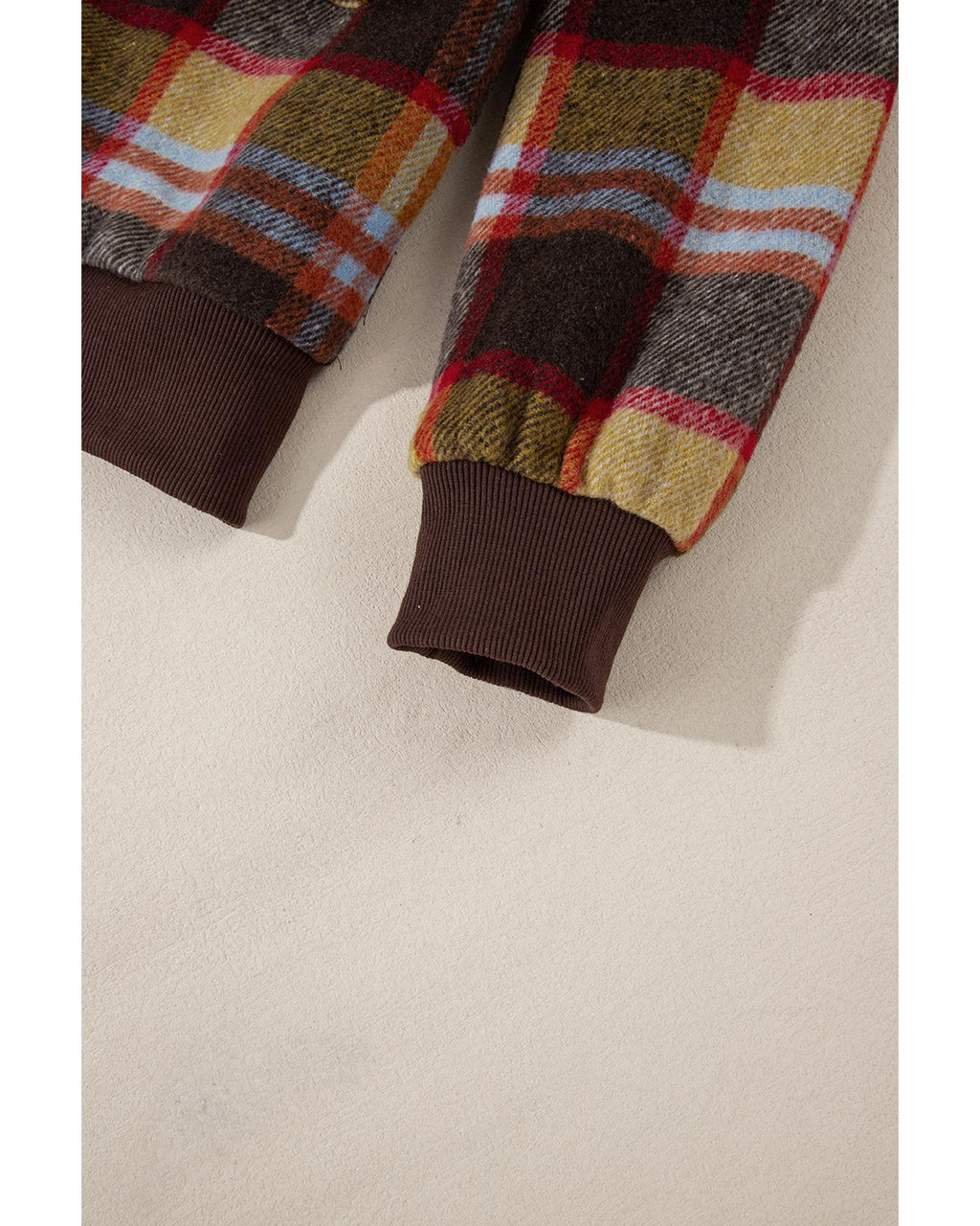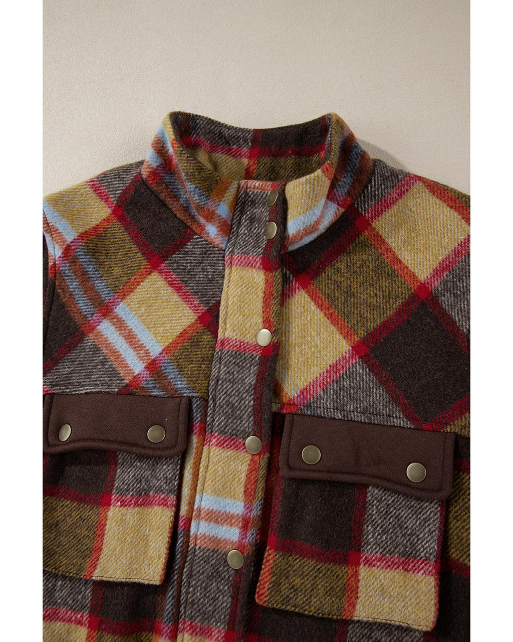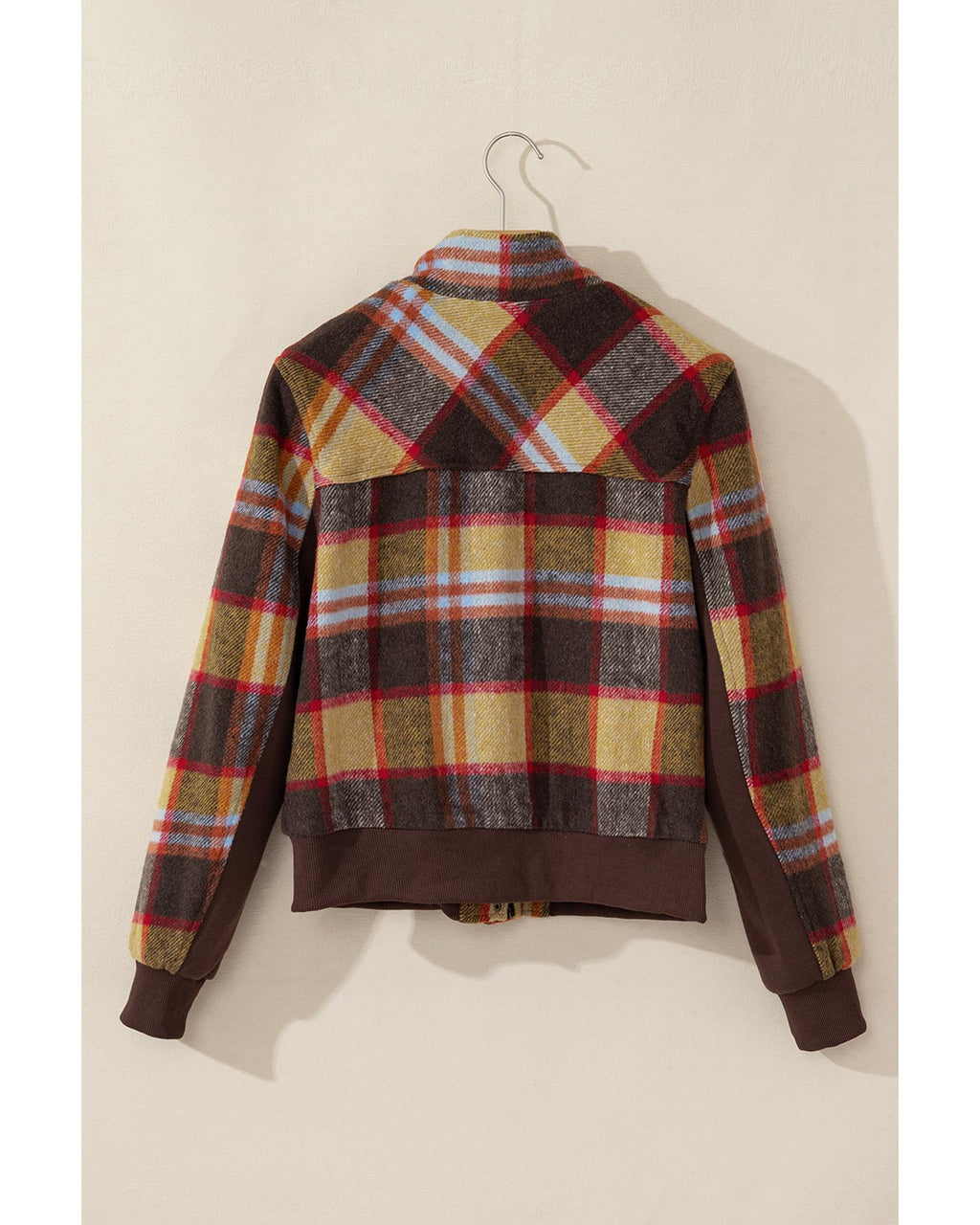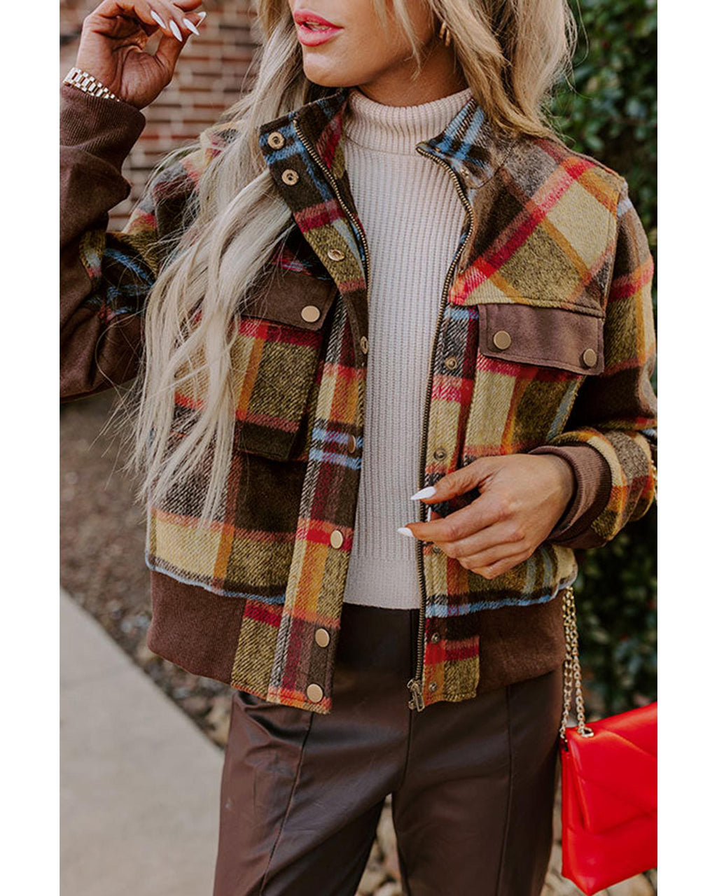 Brown Plaid Print Chest Pockets Button Zipper Stand Neck Jacket - S