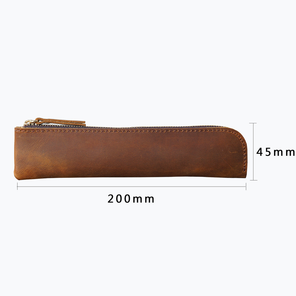 Brown Vintage Crazy Horse Leather Zippered Pen Case - Retro Pencil Pouch & Small Accessories Bag