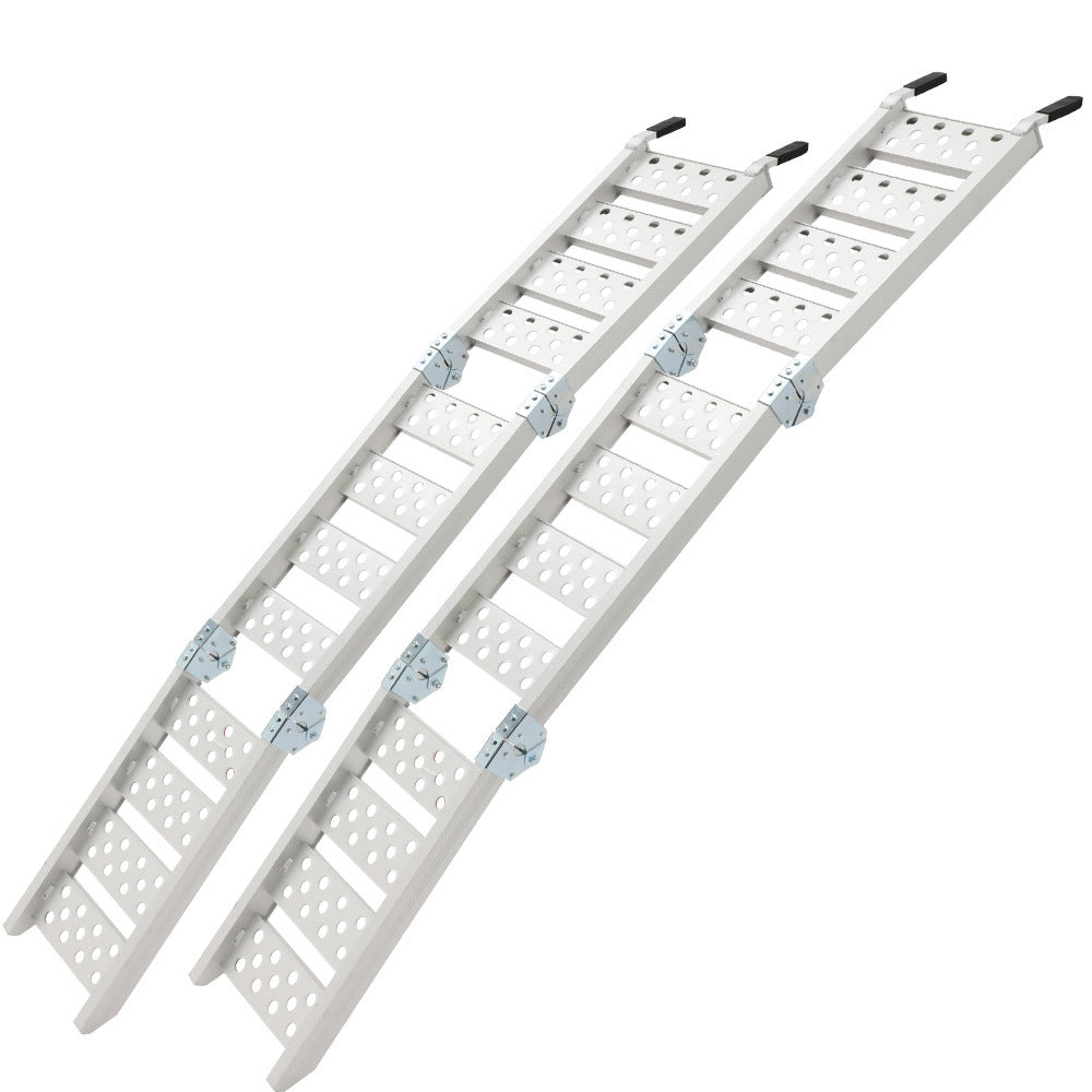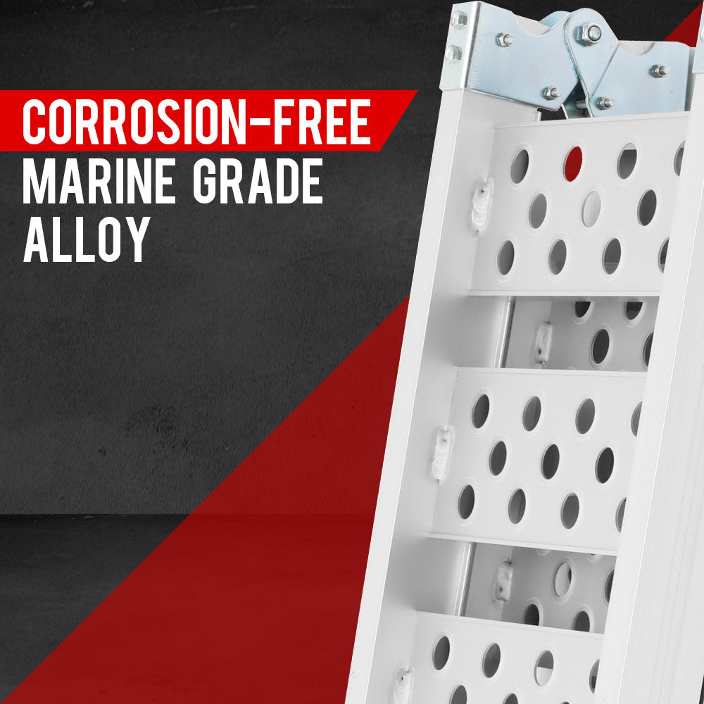 Finished in high quality marine grade alloy these ramps boast a genuine 540kg total capacity that will easily cater for almost every recreational vehicles. These ramps feature an innovative perforated anti-slip design for maximum grip and are come complete with 2 heavy-duty safety straps to provide maximum protection.