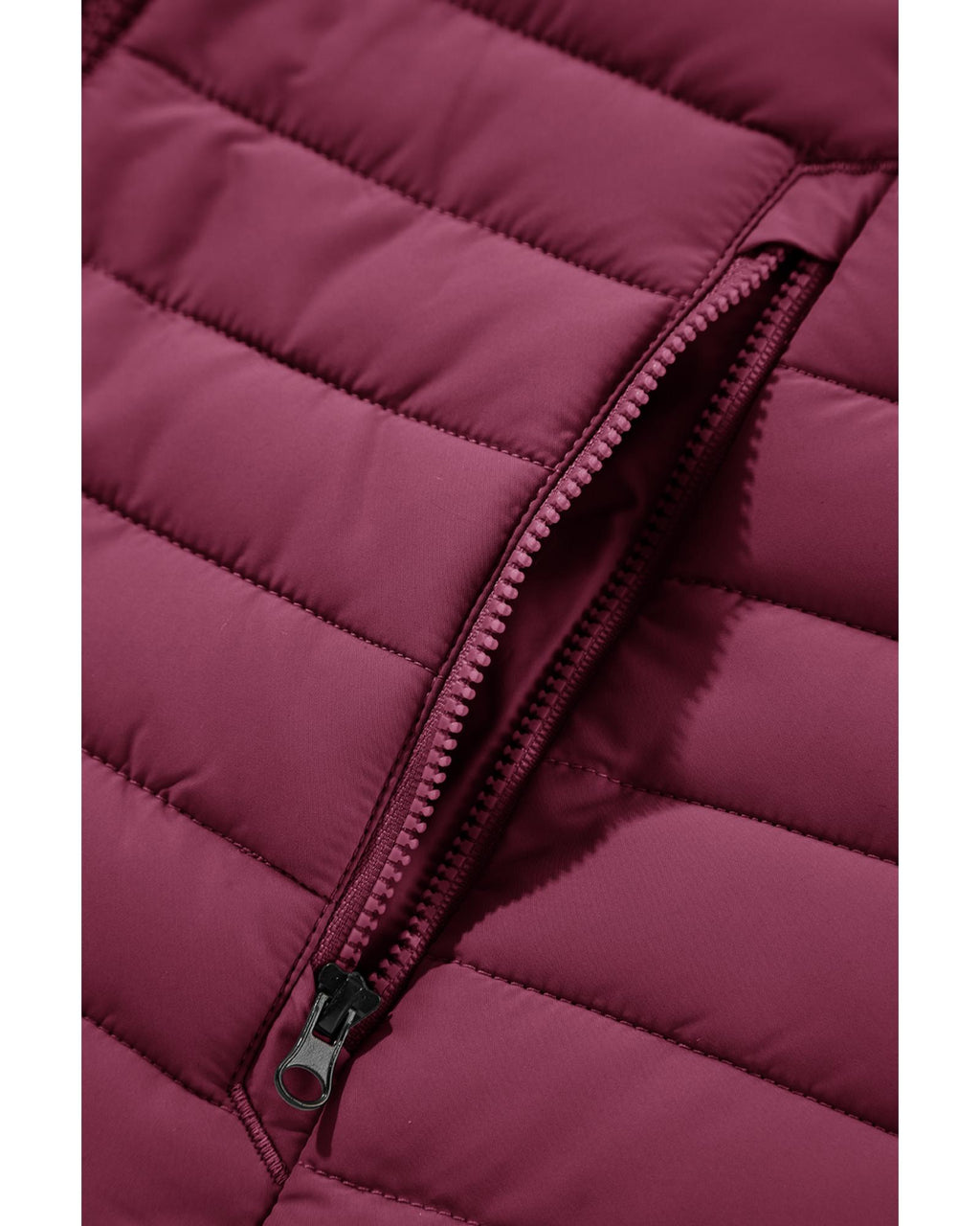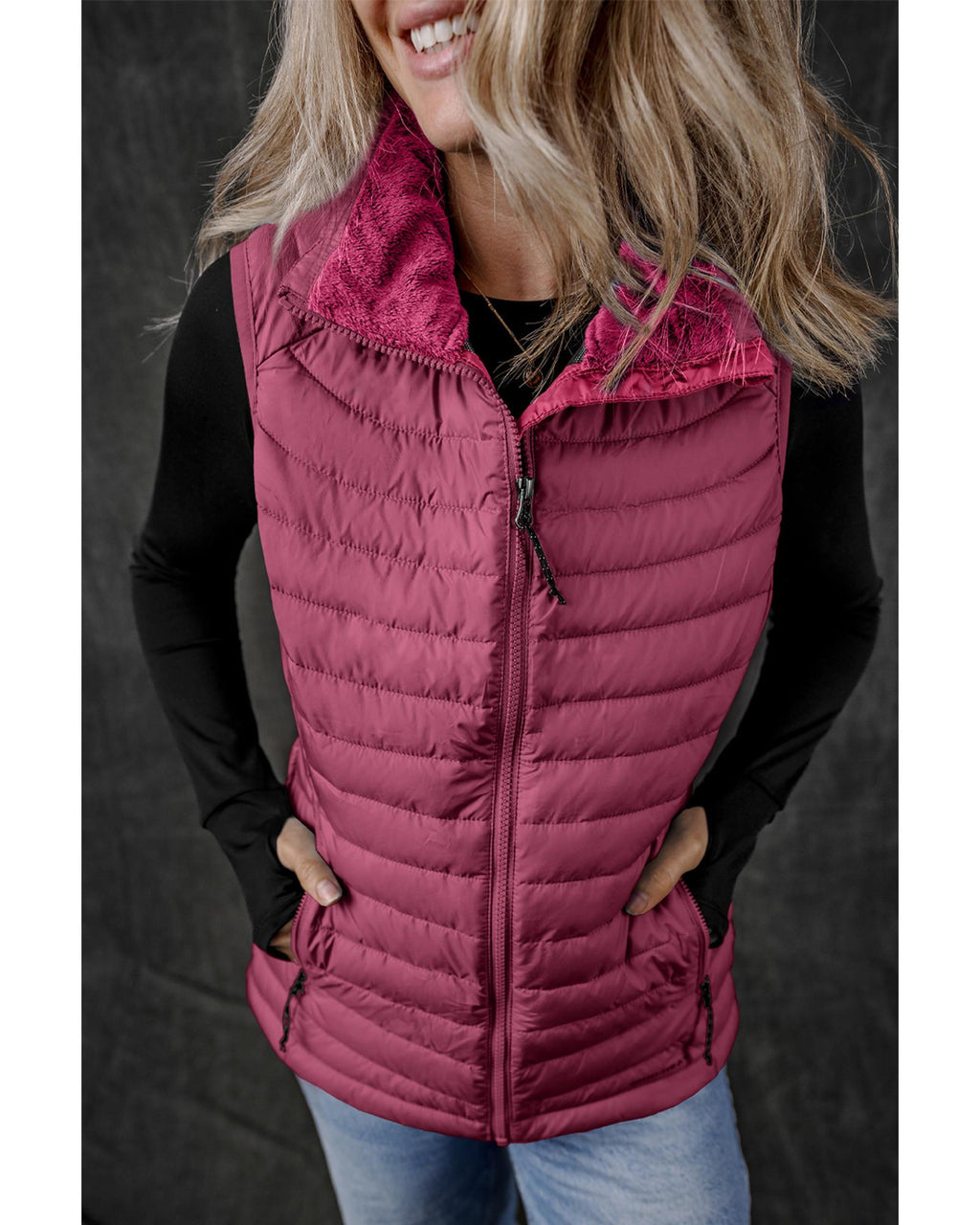 • Burgundy Plush Collared Quilted Zipped Puffer Vest