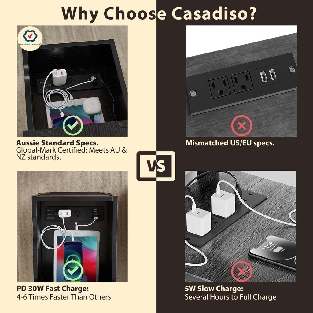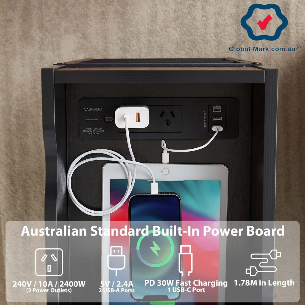 Australian Certified Safety: This unique table is the only one in the market with Australian Global-Mark electrical safety certification. Enjoy worry-free power usage with features like PD30W fast charging, USB-C, and surge protection.