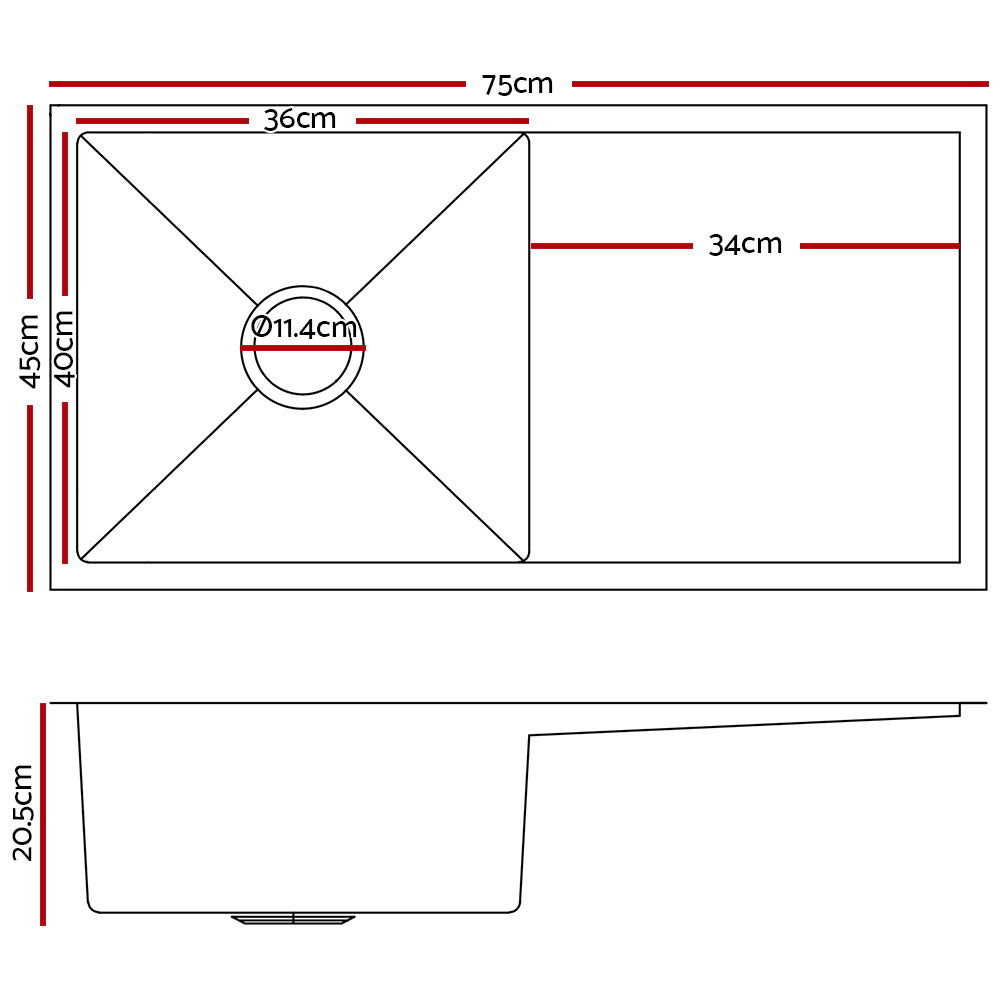 Cefito 75cm x 45cm Stainless Steel Kitchen Sink Under/Top/Flush Mount Black
