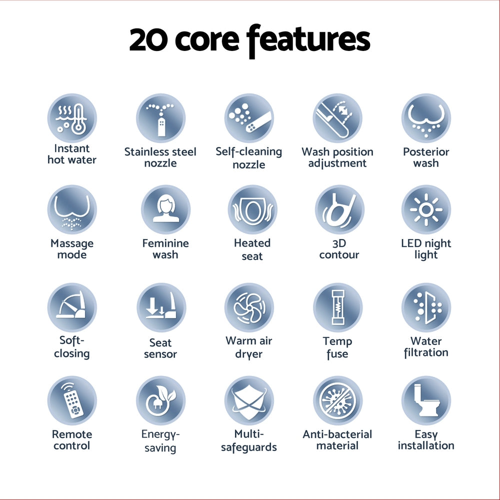 Transform your bathroom into a sanctuary of cleanliness comfort with the Cefito Smart Bidet Toilet Seat. This electronic bidet boasts IPX4 waterproofing and a user-friendly one-knob with adjustable water temperature (up to 40��) and spray intensity. Key features include a self-cleaning stainless steel nozzle, LED night light, and automatic deodorisation. Experience luxury with a heated seat (up to 40��) and warm air dryer. Designed for energy-saving, this Bidet Toilet Seat includes water-filtering and multi-safeguards for peace of mind. Its slow-closing lid adds quiet convenience to your toilet bidet experience.