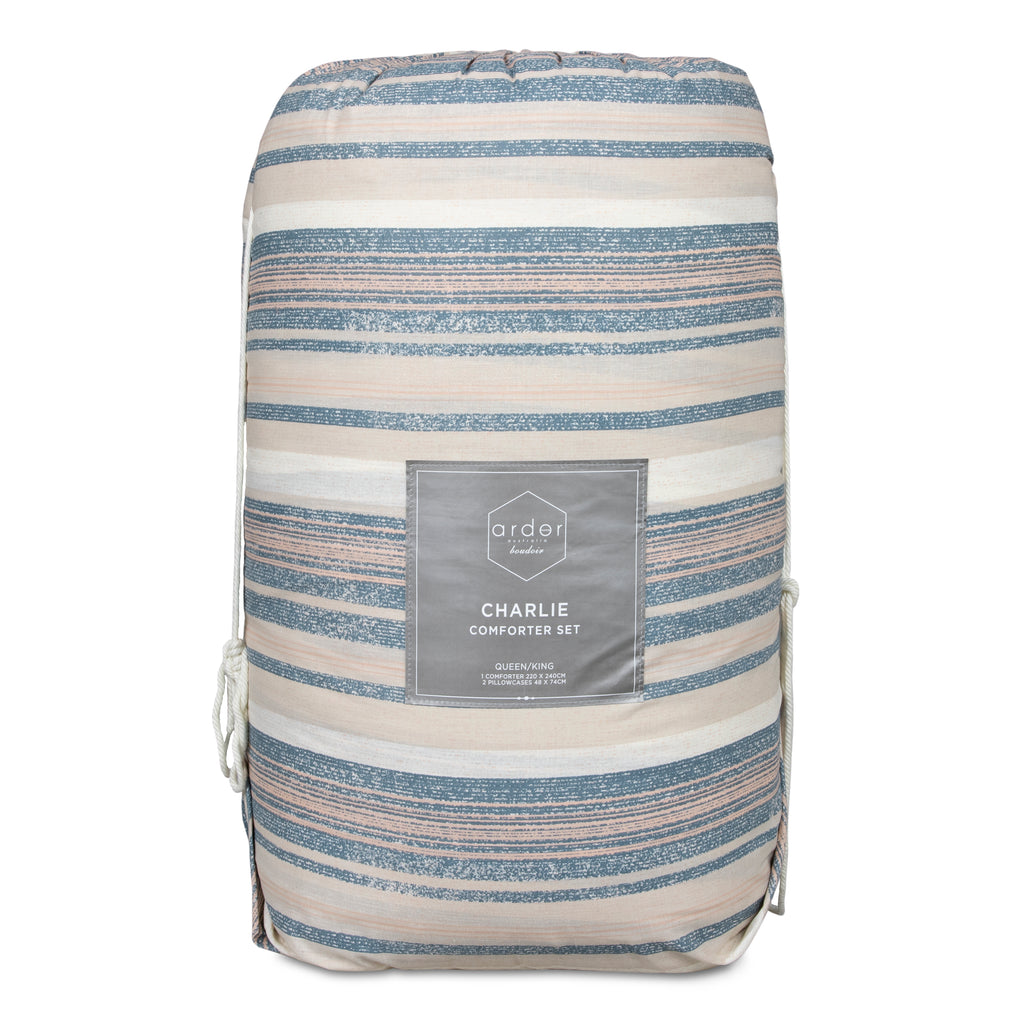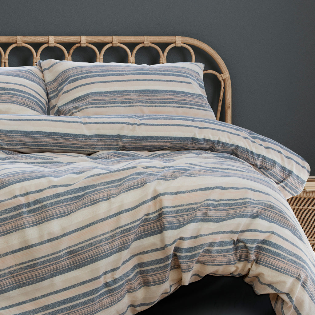 Charlie Comforter Set by Ardor Boudoir is full of both modern and vintage ambience. Weathered striped shades of stormy sea, faded terracotta & oatmeal set a coastal mood for contemporary and classic style.