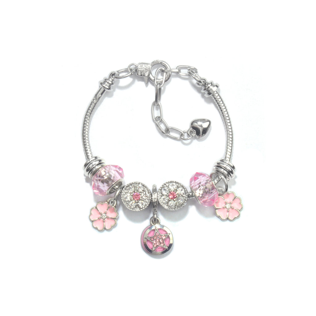 Chic Pink Crystal Beaded Bracelet with Magnolia & Star Pendant(16cm)