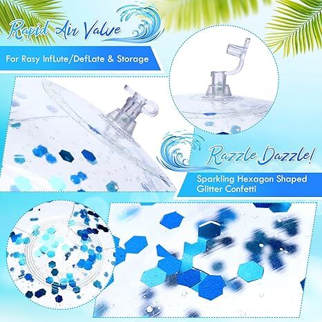 • Glitter Effects: the clear glitter balls will glitter in the pool in the sun, the glitter beach balls contain golden confetti, the confetti rolls with the ball, glittering in the sun to make your parties and games more interesting