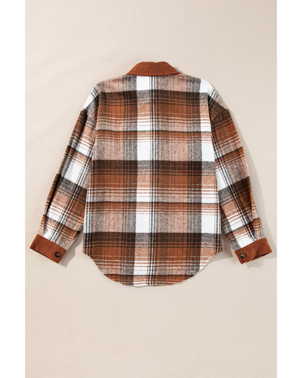Cinnamon Plaid Corduroy Patchwork Chest Pocket Shacket - M