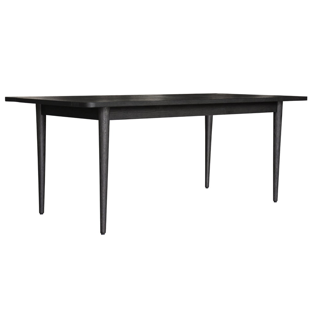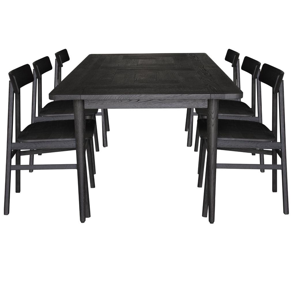 Bring home this lovely dining set in sophisticated industrial style and give your living area the beauty it deserves. The set consists of a 6-seater dining table and 6 chairs. The table in sandblasted black features a geometric parquet pattern on the tabletop that looks gorgeous in a variety of interior decor styles. The dining table has strong, tapered legs. The structural frame of the table is made from solid oak, ply, and oak veneer, all sustainably harvested. The woods make the table strong, and durable. Pair the table with 6-pieces lovely dining chairs with timber seat. The chairs stand out in any decor setting due to their wooden construction and unique back design. The chairs are made of sustainably harvested solid oak wood, with a sandblasted finish in classic black colour. The wood gives the chairs strength and durability. The chairs have a one-of-a-kind appearance, with beautifully designed legs. The fully assembled dining chair and easy to assemble tables come with a one-year warranty.