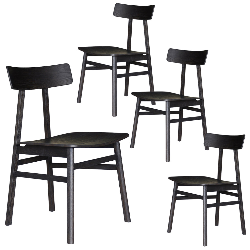 This lovely 4-piece dining chair set with timber seat fills your dining space with comfort and sophistication. It is designed in the Industrial style. It stands out in any decor setting due to its wooden construction and unique back design. The chairs are made of sustainably harvested solid oak wood, with a sandblasted finish in classic black colour. The wood gives the chairs strength and durability. The chairs have a one-of-a-kind appearance, with beautifully designed legs. The fully assembled dining chairs come with a one-year warranty.