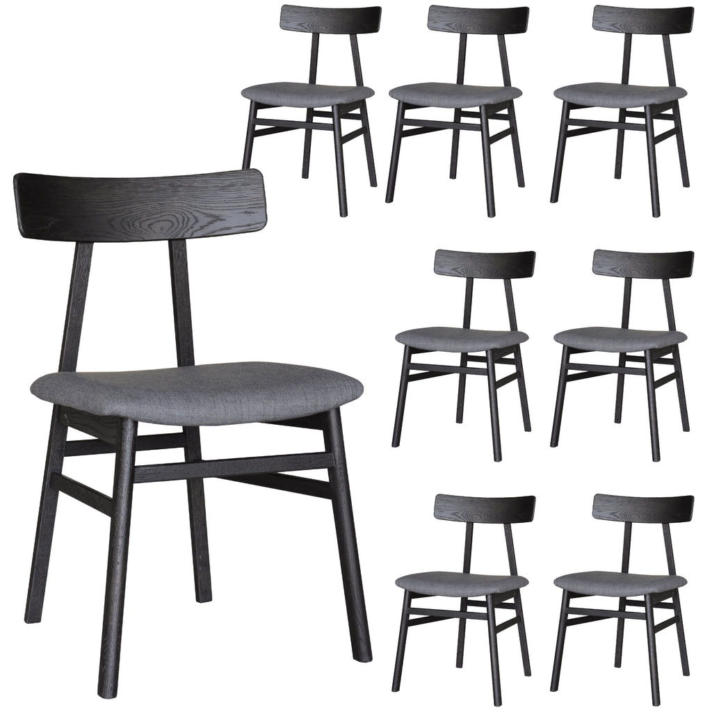 This lovely 8-piece dining chair set with fabric seat fills your dining space with comfort and sophistication. It is designed in the Industrial style. It stands out in any decor setting due to its 100% polyester fabric seat in black and unique back design. The chair frame, including legs, are made of sustainably harvested solid oak wood, with a sandblasted finish in classic black colour. The wood gives the chairs strength and durability. The chairs have a one-of-a-kind appearance, with beautifully designed legs. The fully assembled dining chairs come with a one-year warranty.