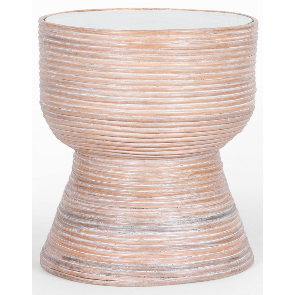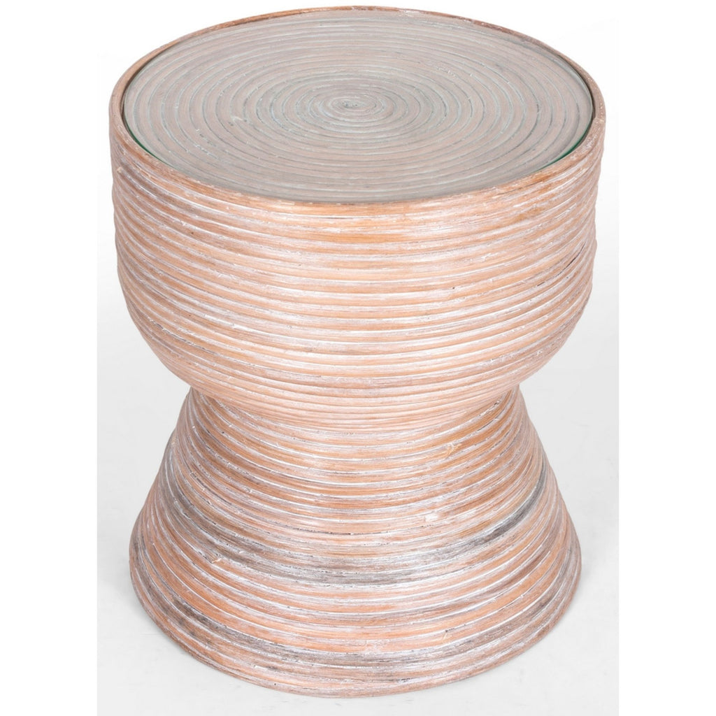 This gorgeous side table adds a fresh beauty to a living room. With its distinct design, round shape, whitewash colour, and glass top, the traditional style side table will beautify your living area. The table is designed in an exotic pattern using sustainably harvested rattan material and a metal frame. It is crafted using a unique weaving and finishing technique. Each piece is handmade from natural cane using age old traditional construction methods and so no two products are the same. Each will come with their own unique variations and look. The material ensures the table's strength, long durability, and beautiful appearance. The stunning indoor furniture will become the perfect companion for any kind of lounge or sofa, while also becoming a beautiful spot to keep lampshades, vases, photo frames, etc. The fully assembled side table comes with a one-year warranty.