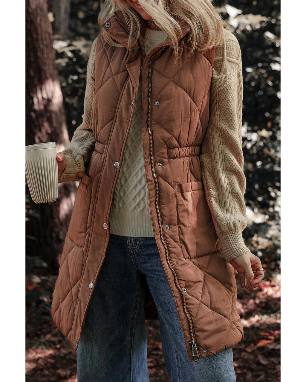 Coffee Longline Quilted Stand Collar Puffer Vest - L