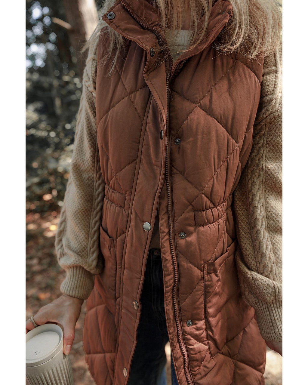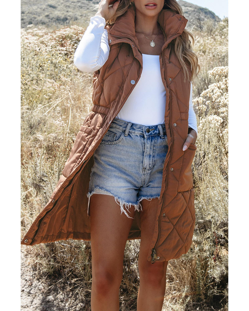 Coffee Longline Quilted Stand Collar Puffer Vest - XL
