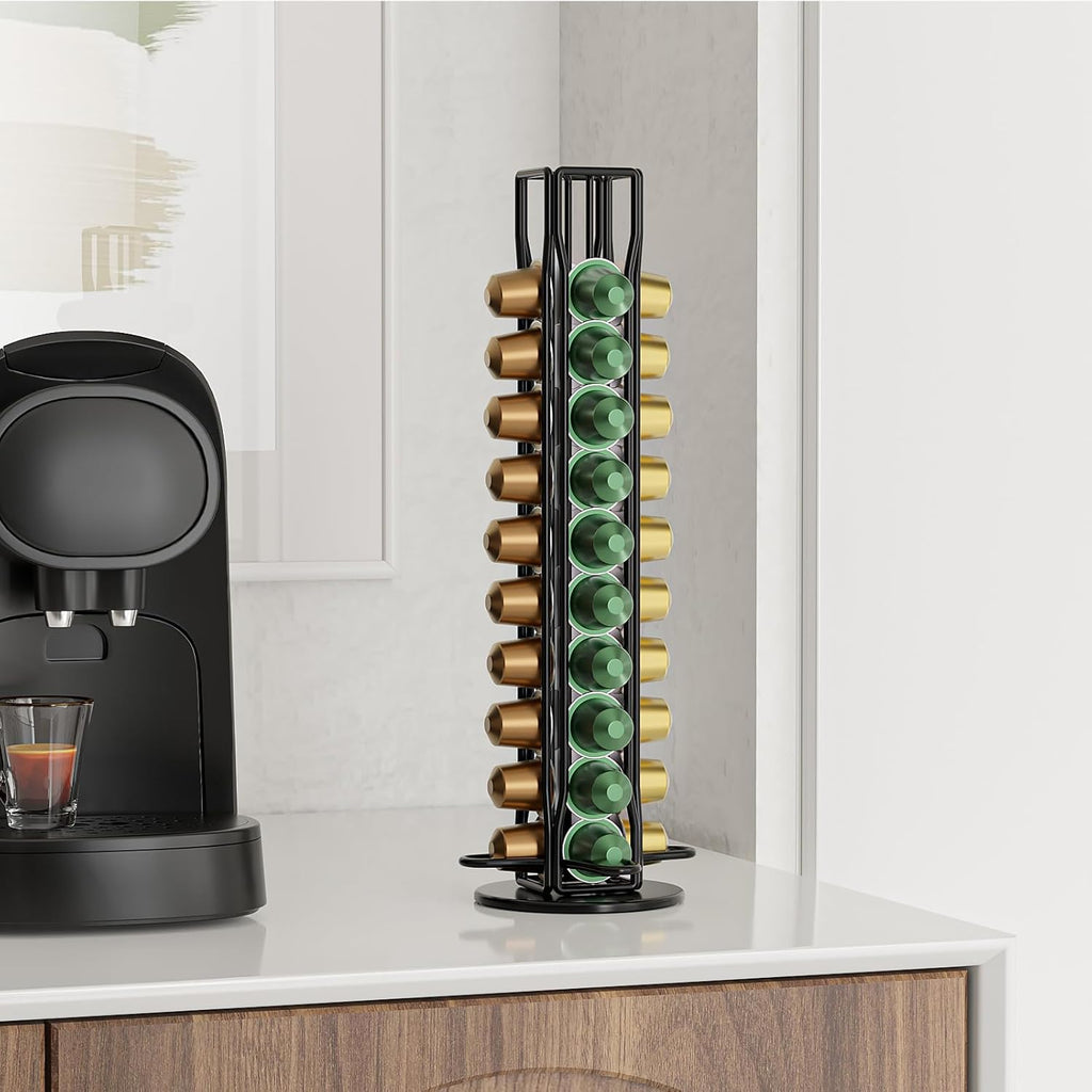 • 360 DEGREE ROTATION: coffee capsules holder spins smoothly with just a touch, very convenient to access your coffee pods from the top or the bottom. Maximize the utility with the smallest area.