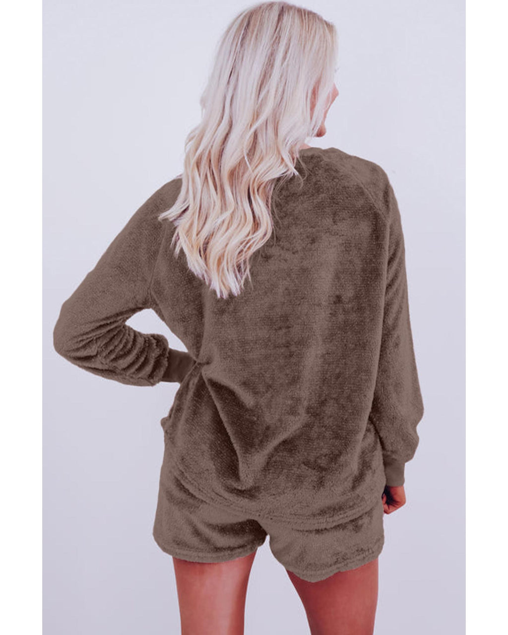 • Coffee Solid Loose Fit Two Piece Fleece Lounge Set