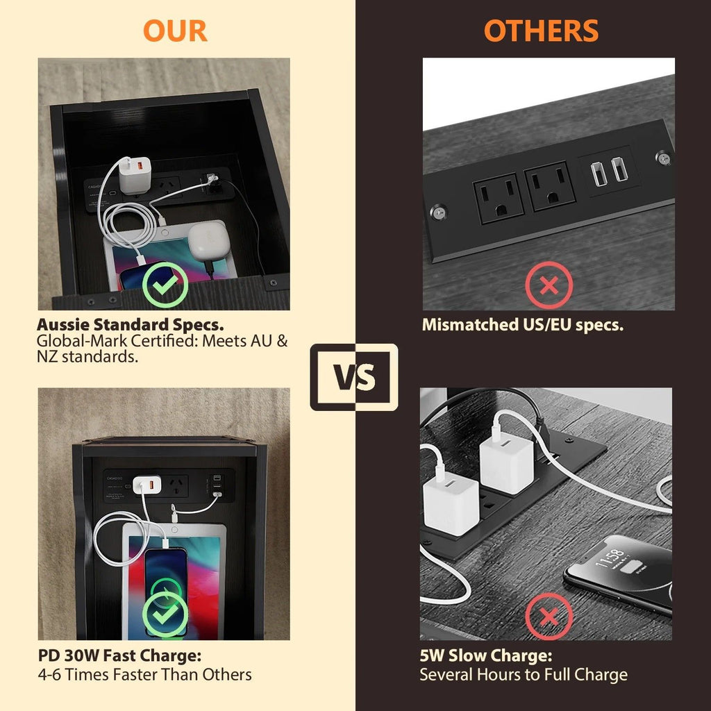- Enjoy the peace of mind that comes with Australian Global-Mark electrical safety certification with this unique table. Charge your devices quickly and safely with PD30W fast charging, USB-C, and surge protection.