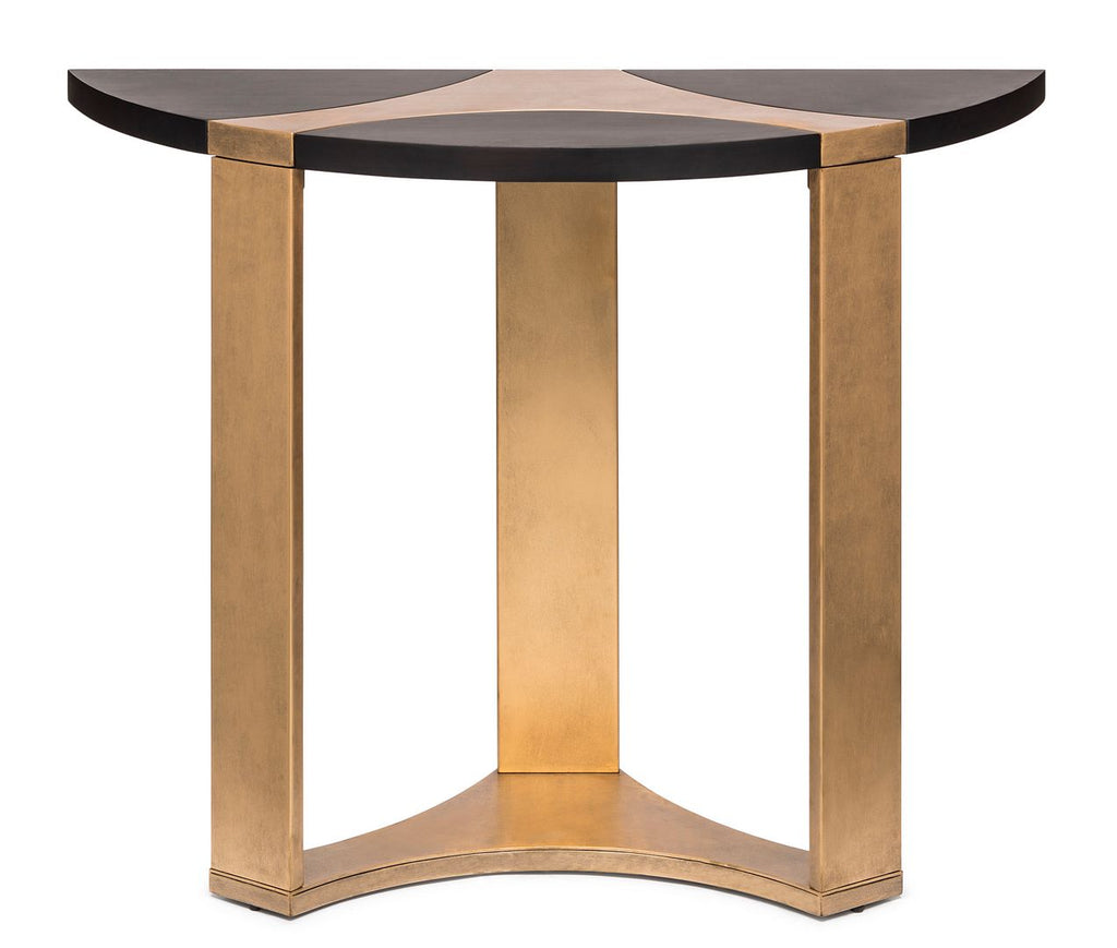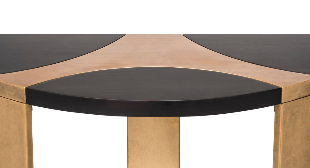 This intricately crafted Contemporary Half Round Brass and Black Hallway Console Table is an absolute delight for your interior space. The stunning visual of the Black Wood Top integrating with the vibrant French Brass frame is an example of pure engineering genius that projects nothing but meticulous appeal. The Half Moon shape of this Console Table allows it to be perfectly placed against the wall, making it ideal to place home essentials, especially because of the large surface top. All in all, a Hallway Console that is the perfect mix of aesthetics and utility.