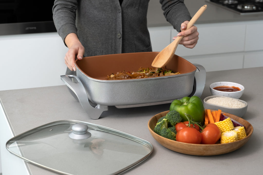Sear meats, simmer curries, sauté veggies, scramble eggs, bake a casserole, fry chicken, all in one pan… the options are endless with this banquet-size 9.1 litre capacity Copper Electric Fry Pan. With a spacious 38 x 30 centimetre working surface, sorting out tonight’s dinner or dishing up a masterpiece for your next banquet or gathering is as simple as plug – cook – unplug – and serve.