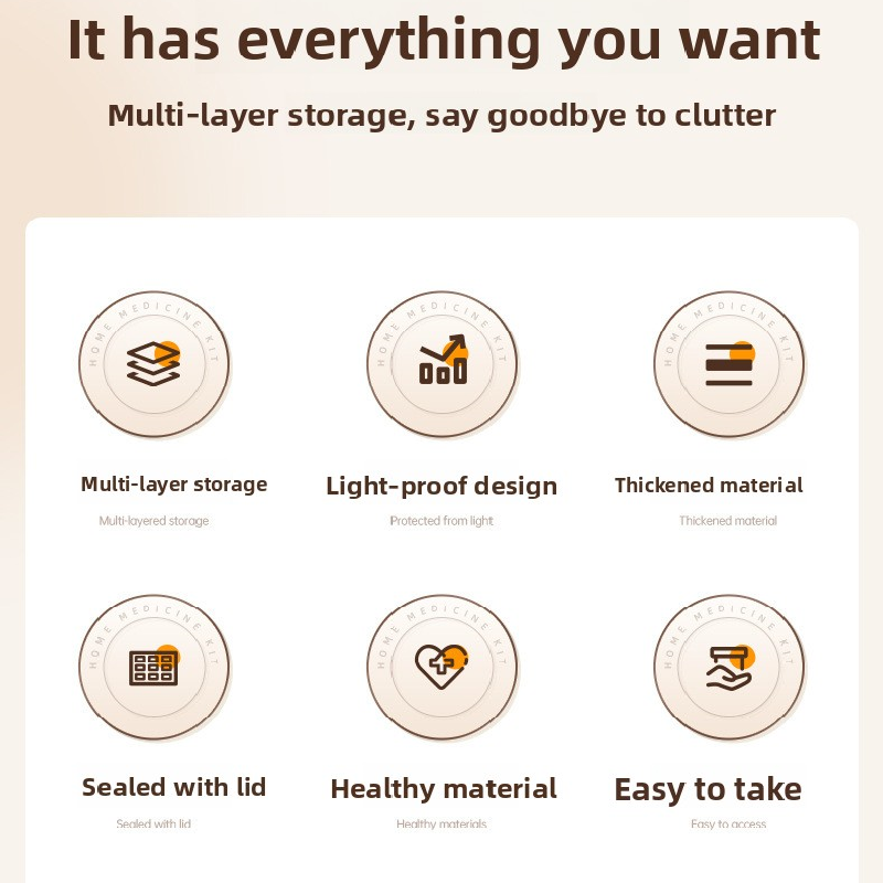 • Smart 3-Layer Partitioning: The box is divided into three distinct levels: a top tray for emergency items and small tools, a middle layer for frequently used medications, and a deep bottom compartment for large bottles and spare stock.
