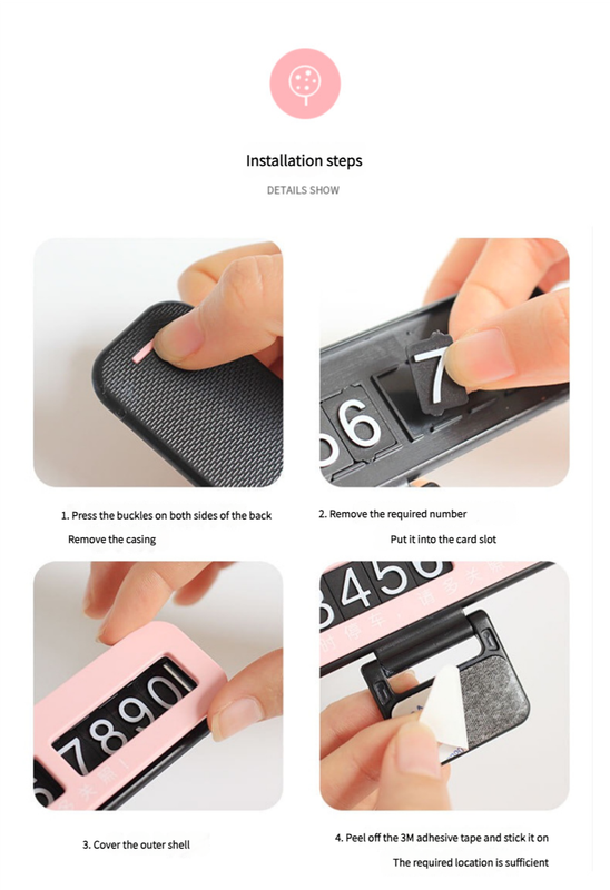 - Customizable parking number plate with 0-9 digits and 6 number slots