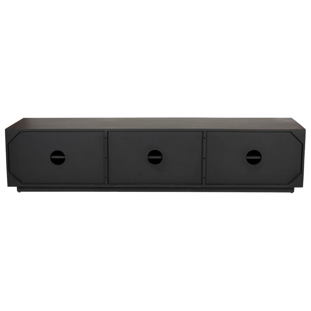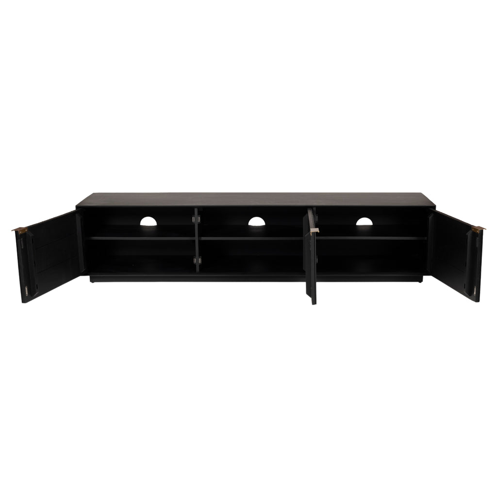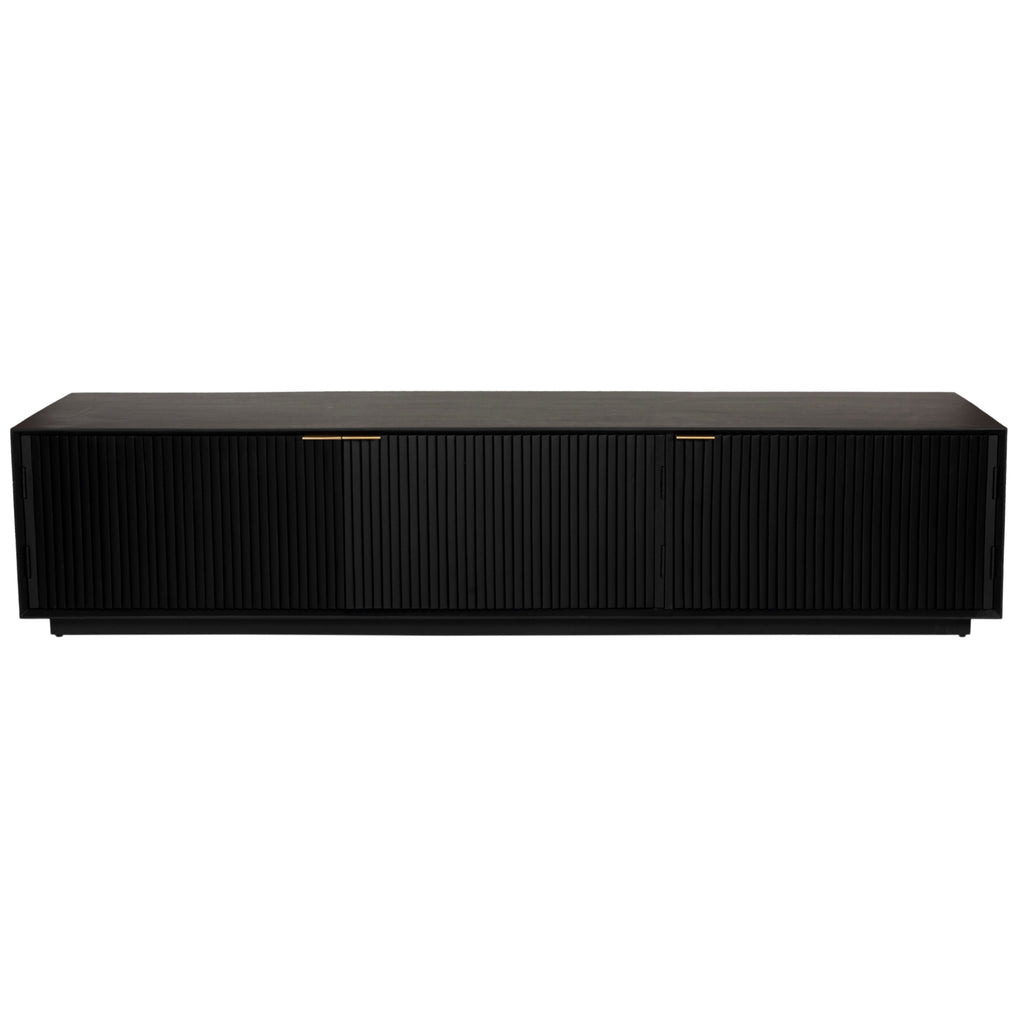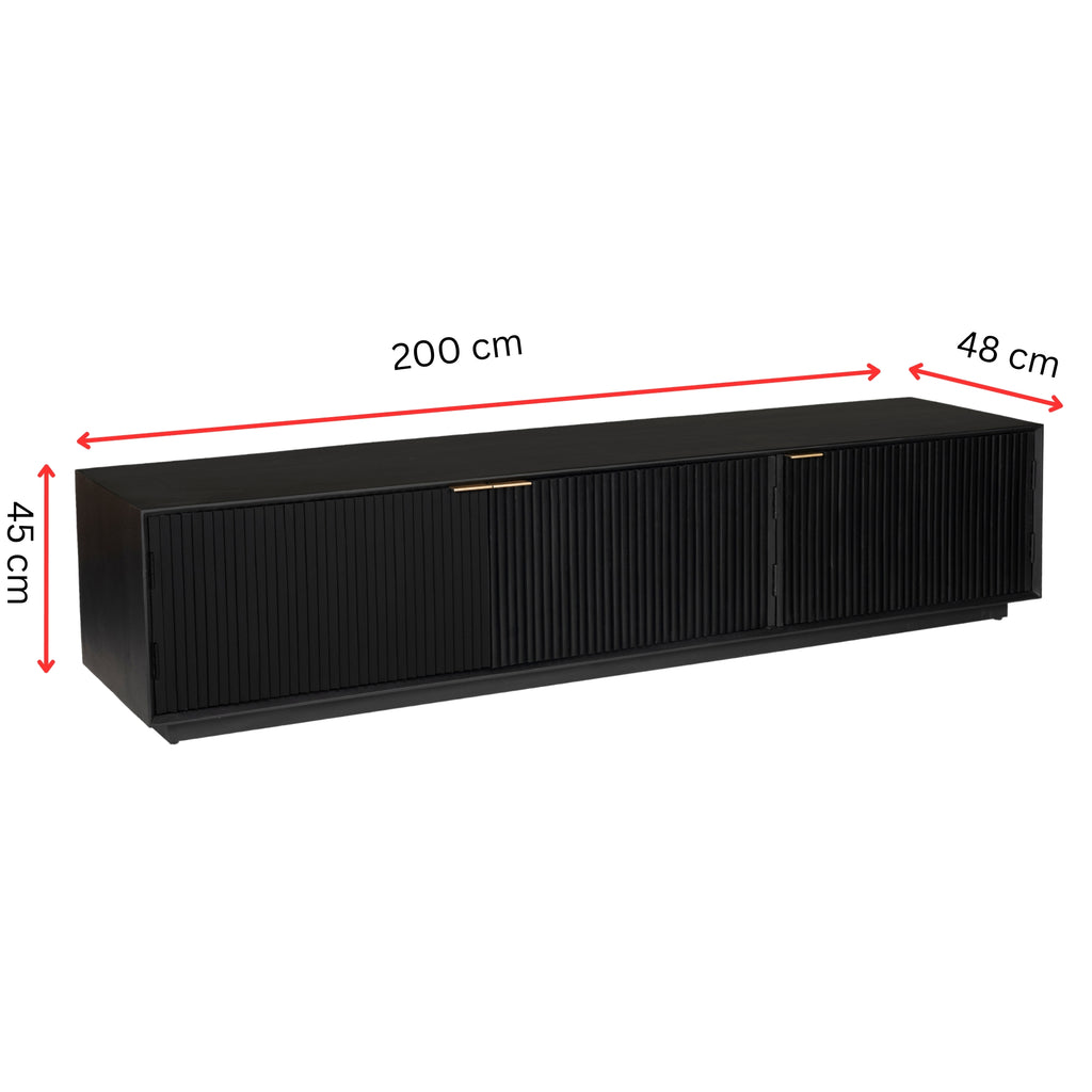 Here’s an ETU that not only looks beautiful, but also solves living area’s storage space problem to a great extent. The TV unit with 3 doors, covering spacious compartments, is a highly useful piece of furniture. It has magnetic door latches on all doors. The doors also have metal handles in gold colour. Designed in mid-century style, the TV unit in black is made of sustainably harvested MDF and mangowood and features fluted detailing. The wood provides the ETU with strength and good looks. The TV unit has robust base made of solid mangowood. A one-year warranty is included with the easy-to-assemble TV unit.