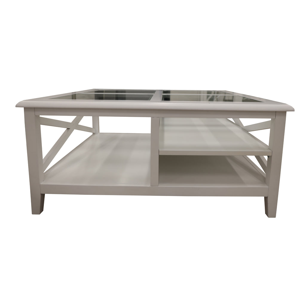 In white, this versatile coffee table is a lovely piece of furniture. It is a unique coffee table with plenty of storage space in the form of open shelves. It features 5mm tempered glass on the tabletop and cross design on both sides, that enhance its beauty. The beautiful white table is designed in the Hampton style. It has tapered legs. The table is made of high-quality Solid Acacia Wood and MDF, obtained in a sustainable manner. The wood makes the table surface silky smooth, super strong, and also resistant to moisture and extreme temperatures. A one-year warranty is included with the fully assembled coffee table.