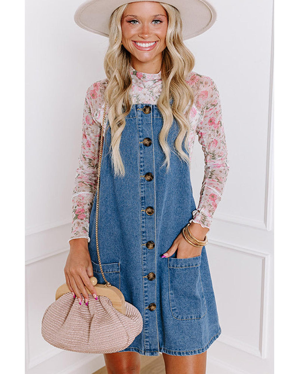 Dusk Blue Wide Strap Button Front Pocketed Denim Mini Dress - M