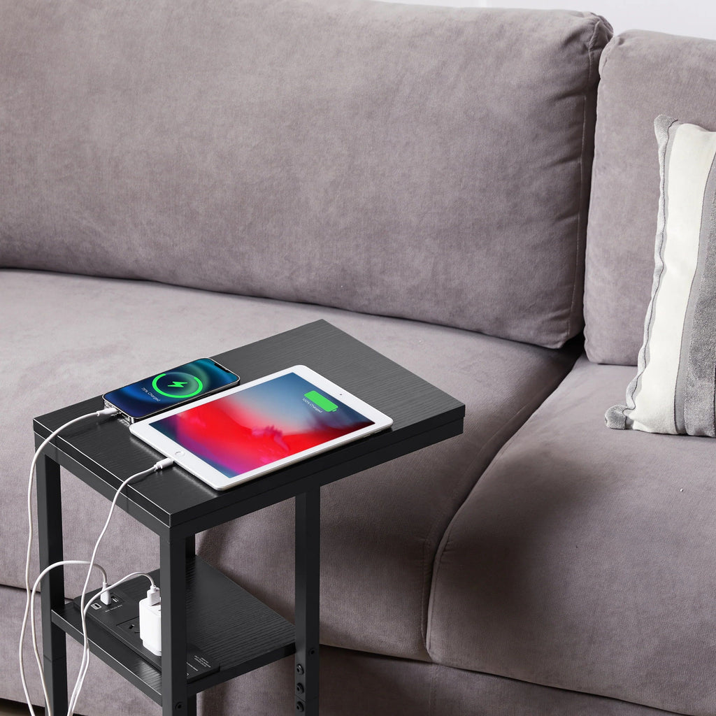 - This sleek and stylish bedside table is the perfect addition to any bedroom, living room, or hallway. It offers a convenient charging station, so you can keep your devices powered up and ready to go. Its modern black design adds a touch of sophistication to any space, from contemporary living rooms to narrow hallways.